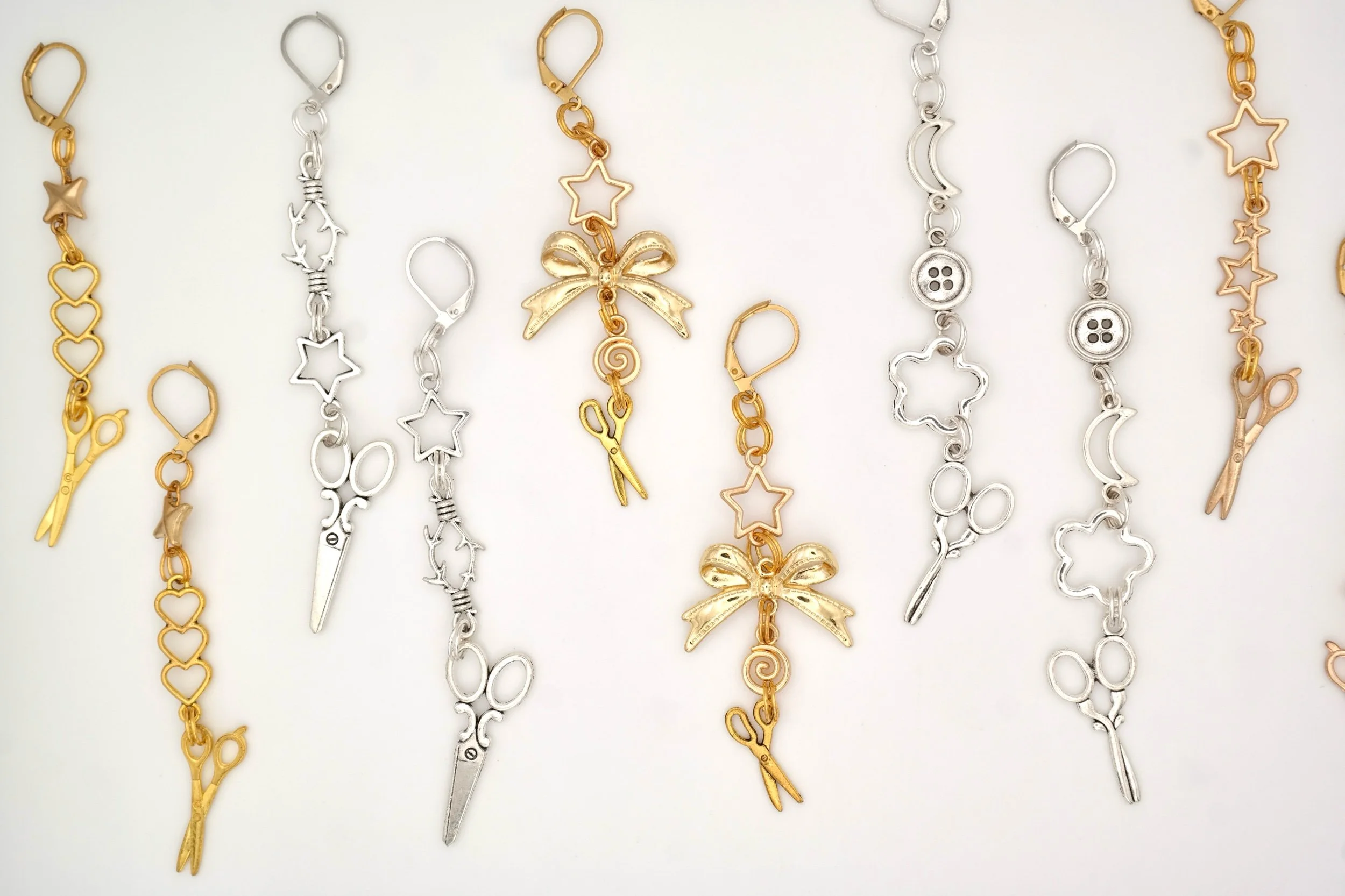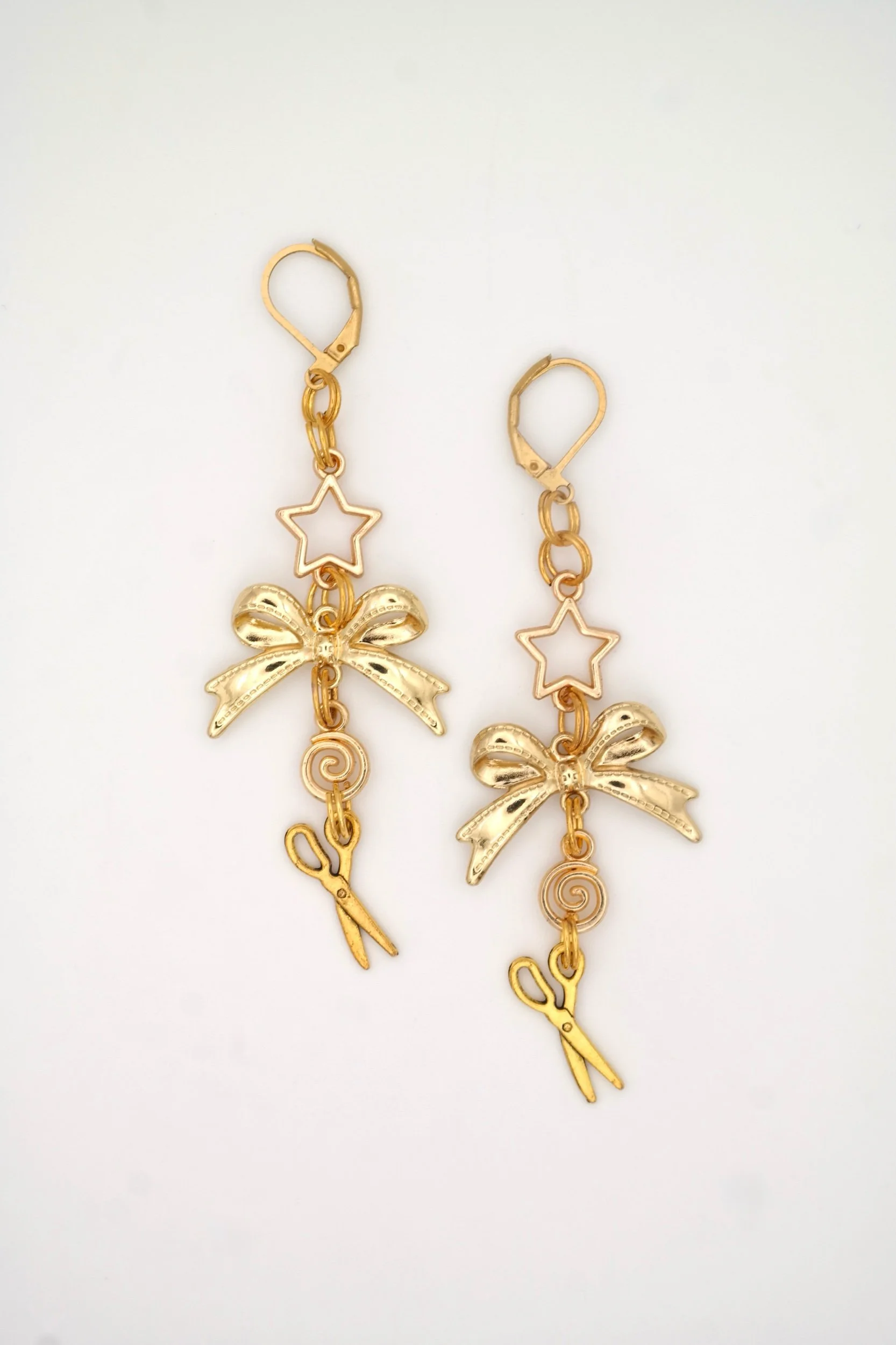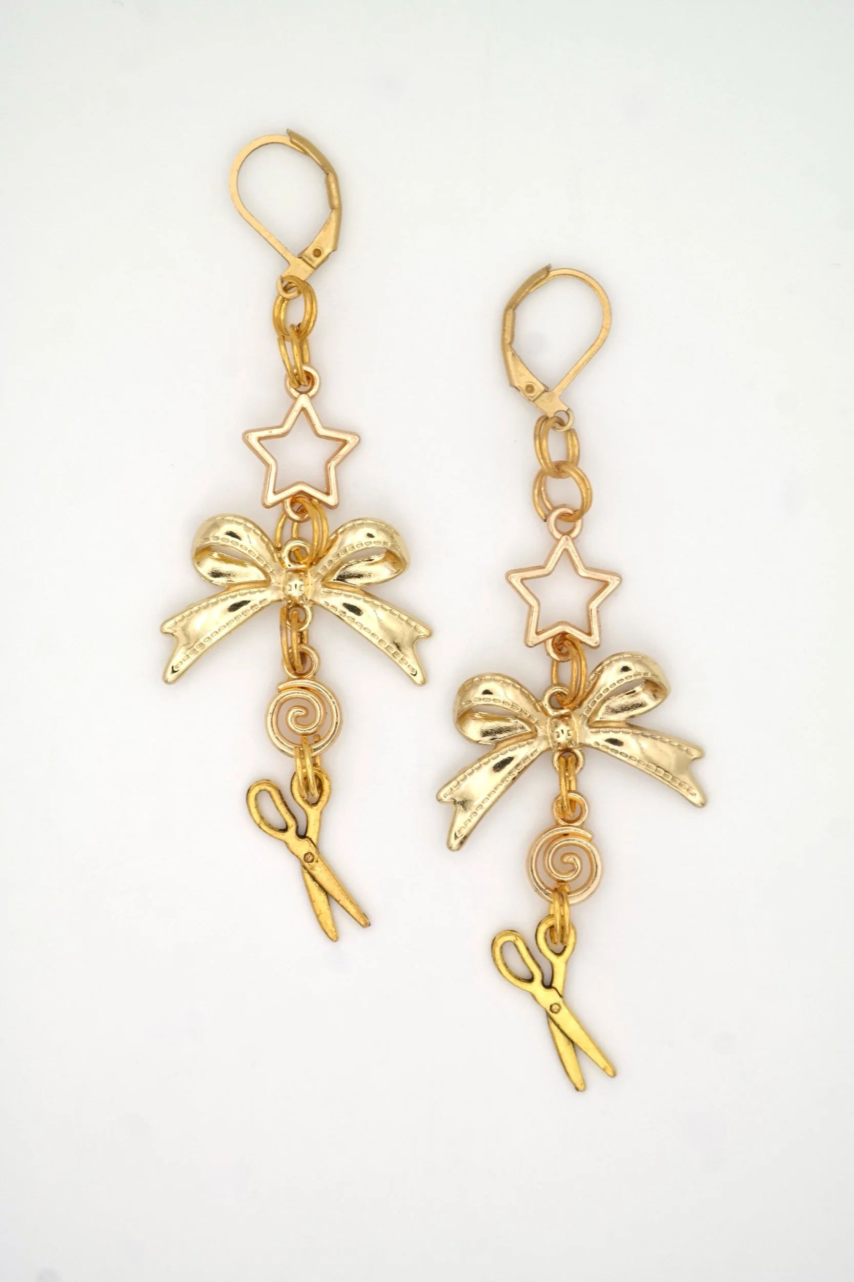 These gold earrings are perfect for a lesbian, sapphic, or hairdresser! They hang hollow star beads, bows, swirls, and the cutest scissor charms. The gold earring hooks clip in the back to be secured.
