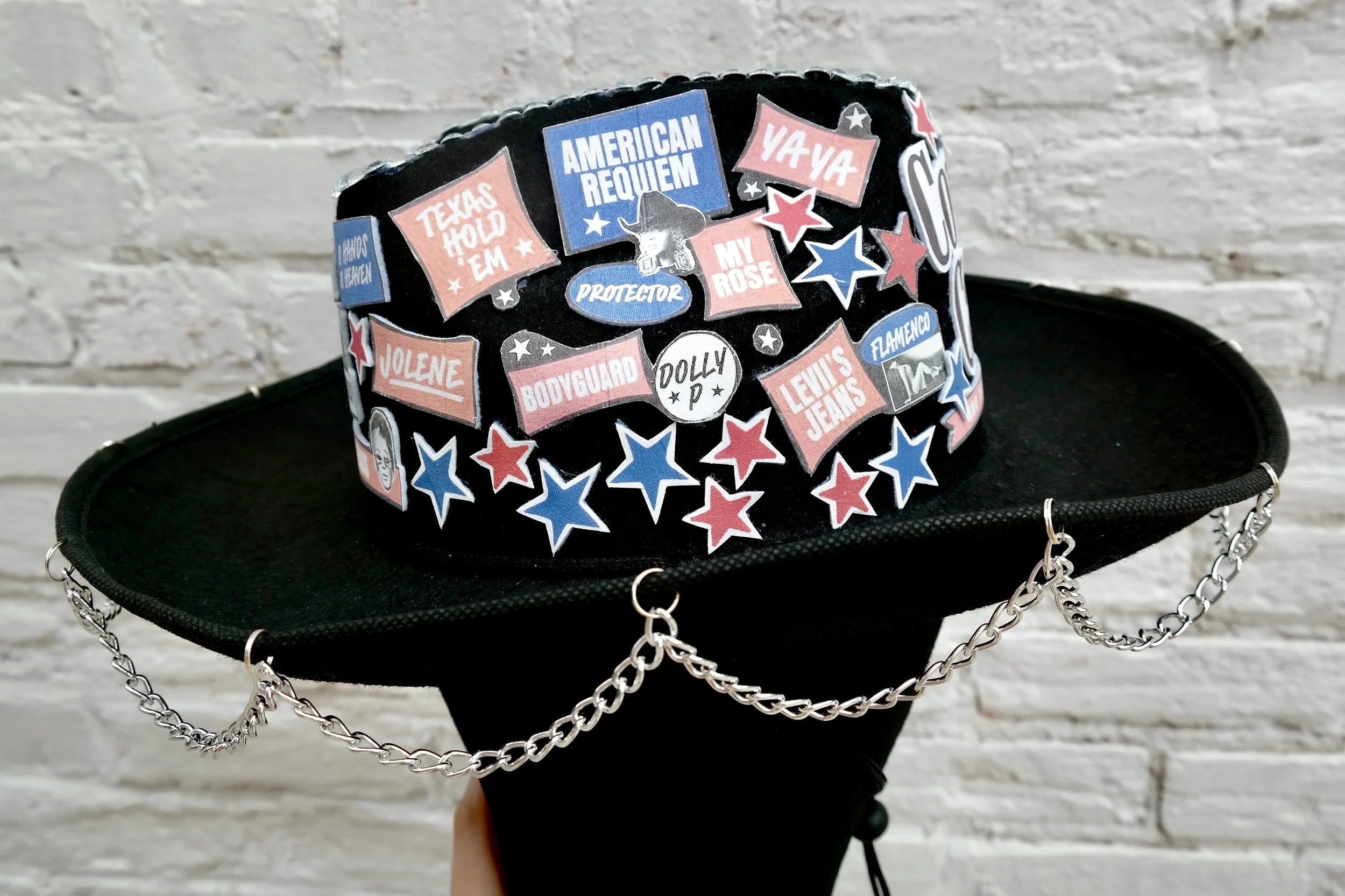 The perfect cowboy hat for Beyoncé’s Cowboy Carter tour! This handcrafted cowgirl hat is black with “Cowboy Carter” printed on the front in big black letters. Printed all around the hat are visuals from the announcement of the Cowboy Carter album, including the entire song list and images of Beyoncé. On the front says “and the Rodeo Chitlin’ Circuit”, and other text says “brought to you by Kntry Radio Texas”, “act ii” and “Live from Texas”. Also decorated around the hat are blue and red stars. The top of the hat is covered in silver gemstones, and the brim hangs loops of silver chain.
