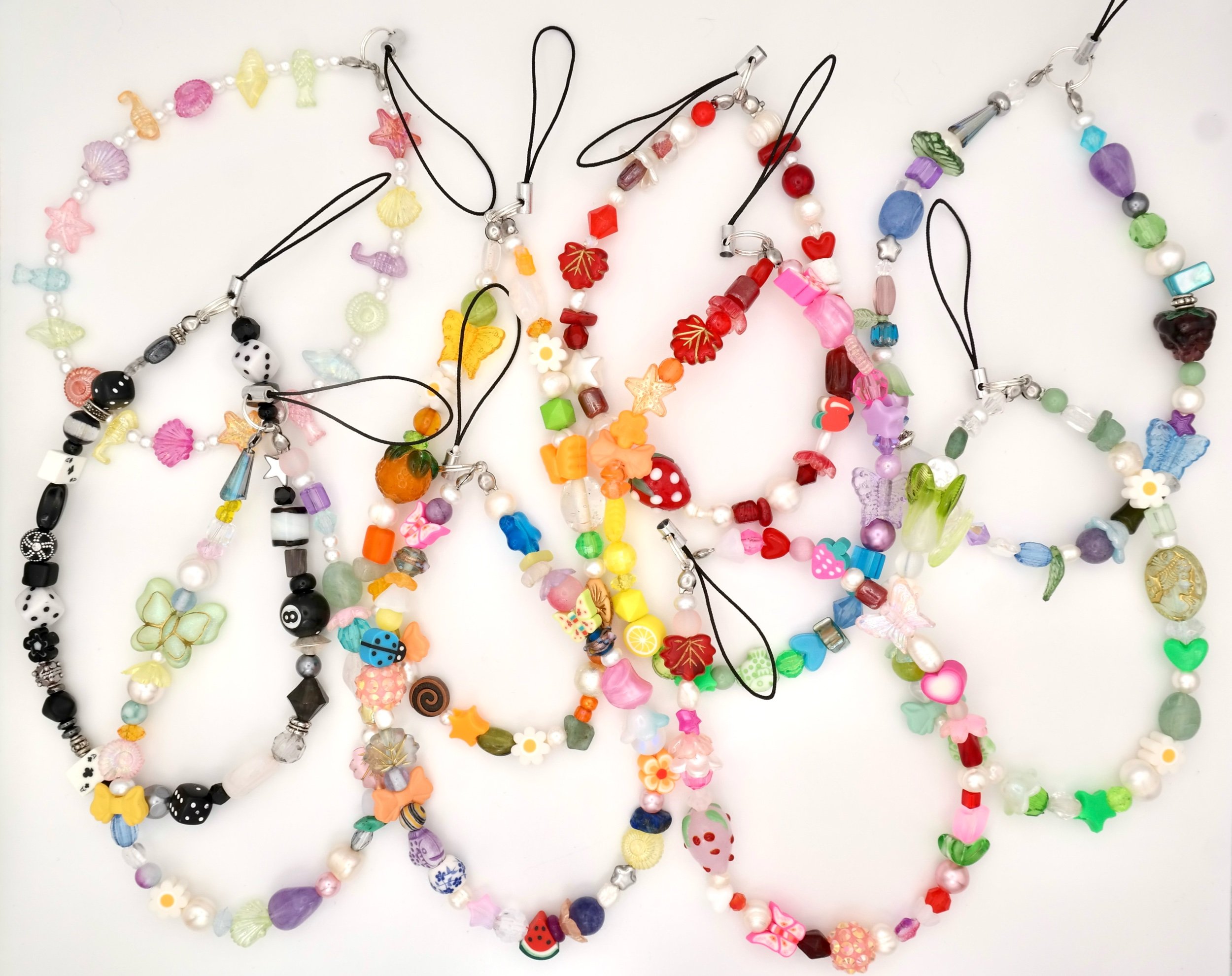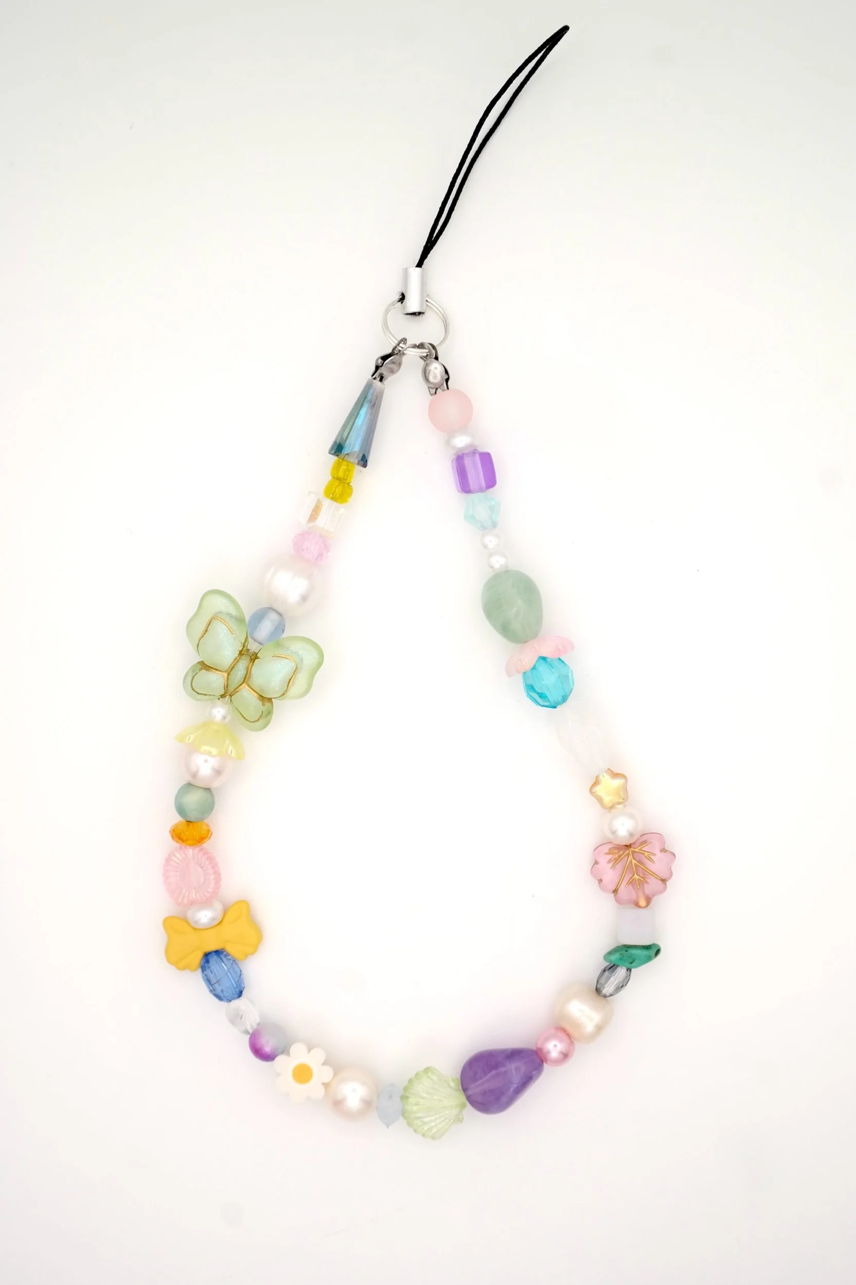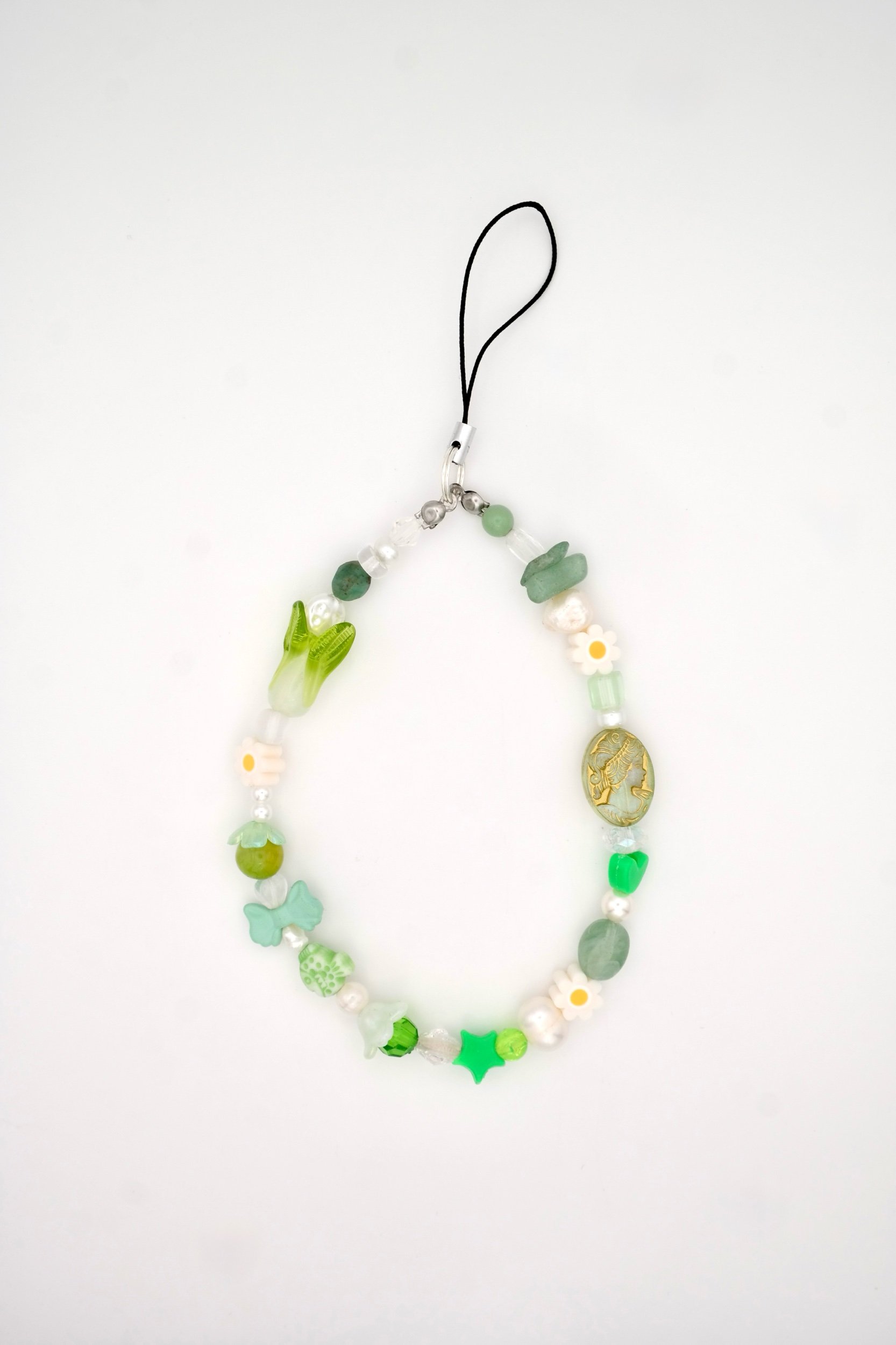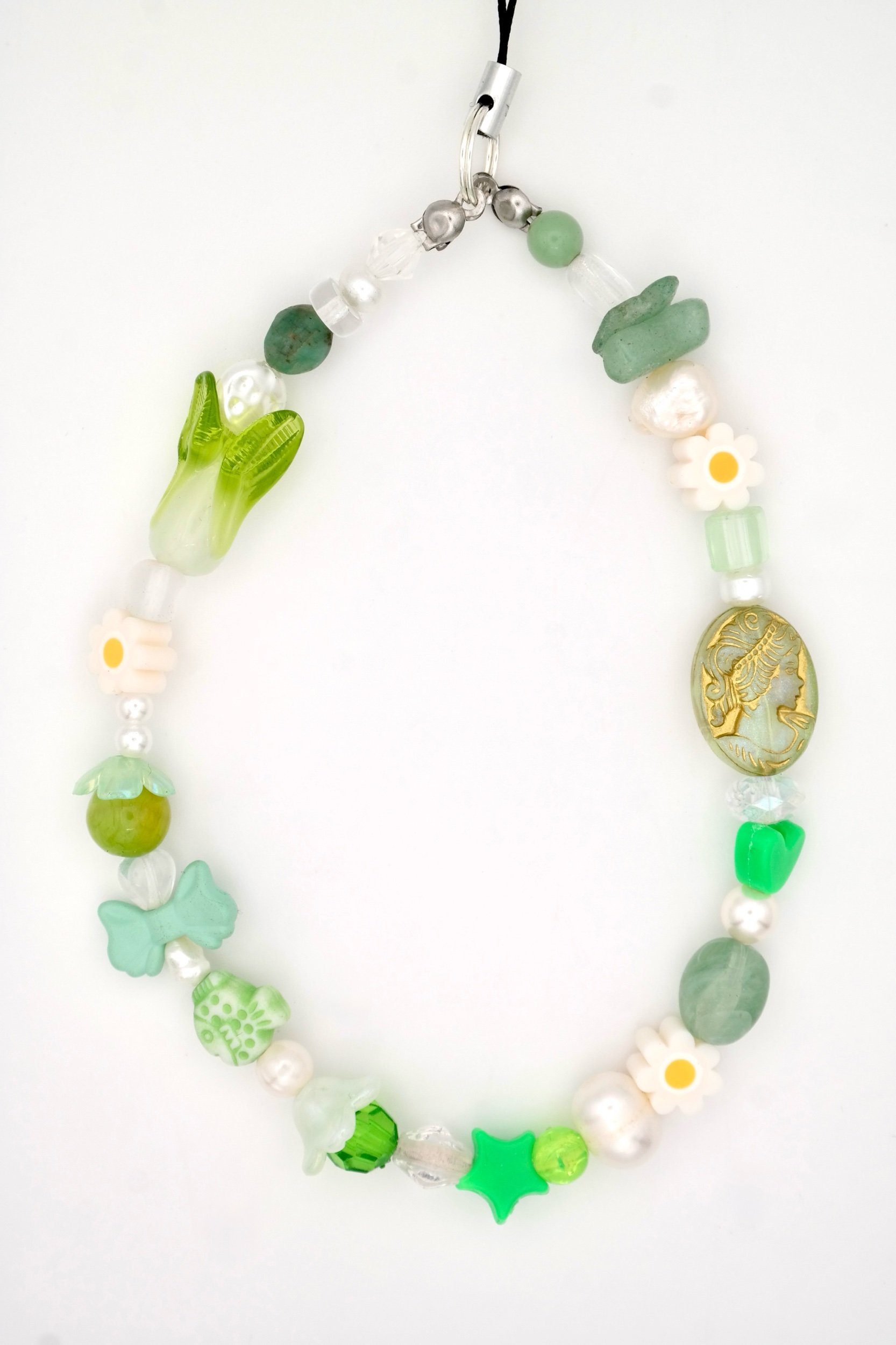 This beaded phone charm is a loop of green beads and pearls, featuring a beautiful glass Chinese cabbage. It hangs from a small black string loop, which can be attached to a phone case. Beads include three daisies, a green fish, a green bow, a green side portrait of a woman, a green heart, a green star, green flowers, and other unique shapes. The details that attach the phone charm together are silver.