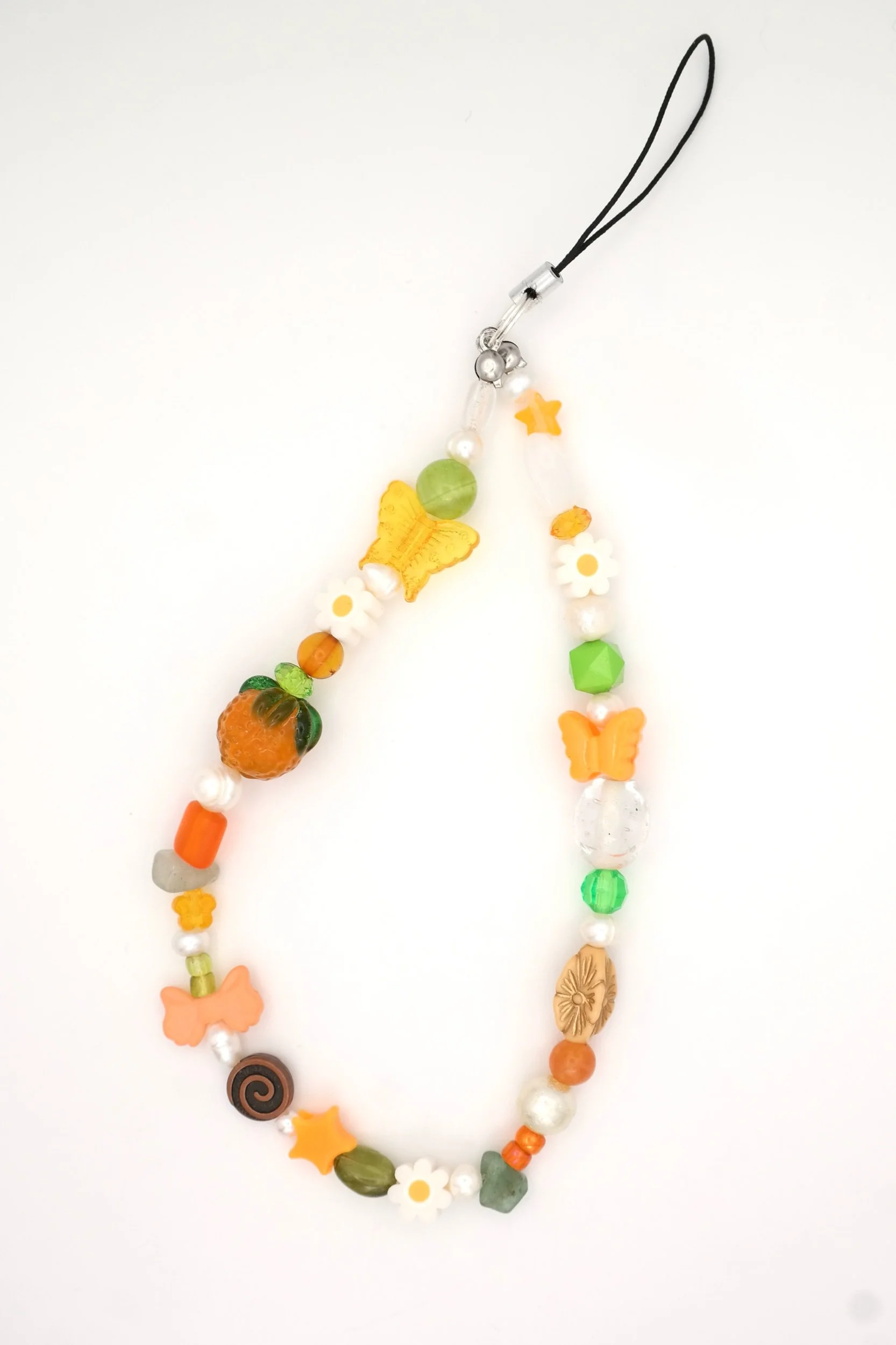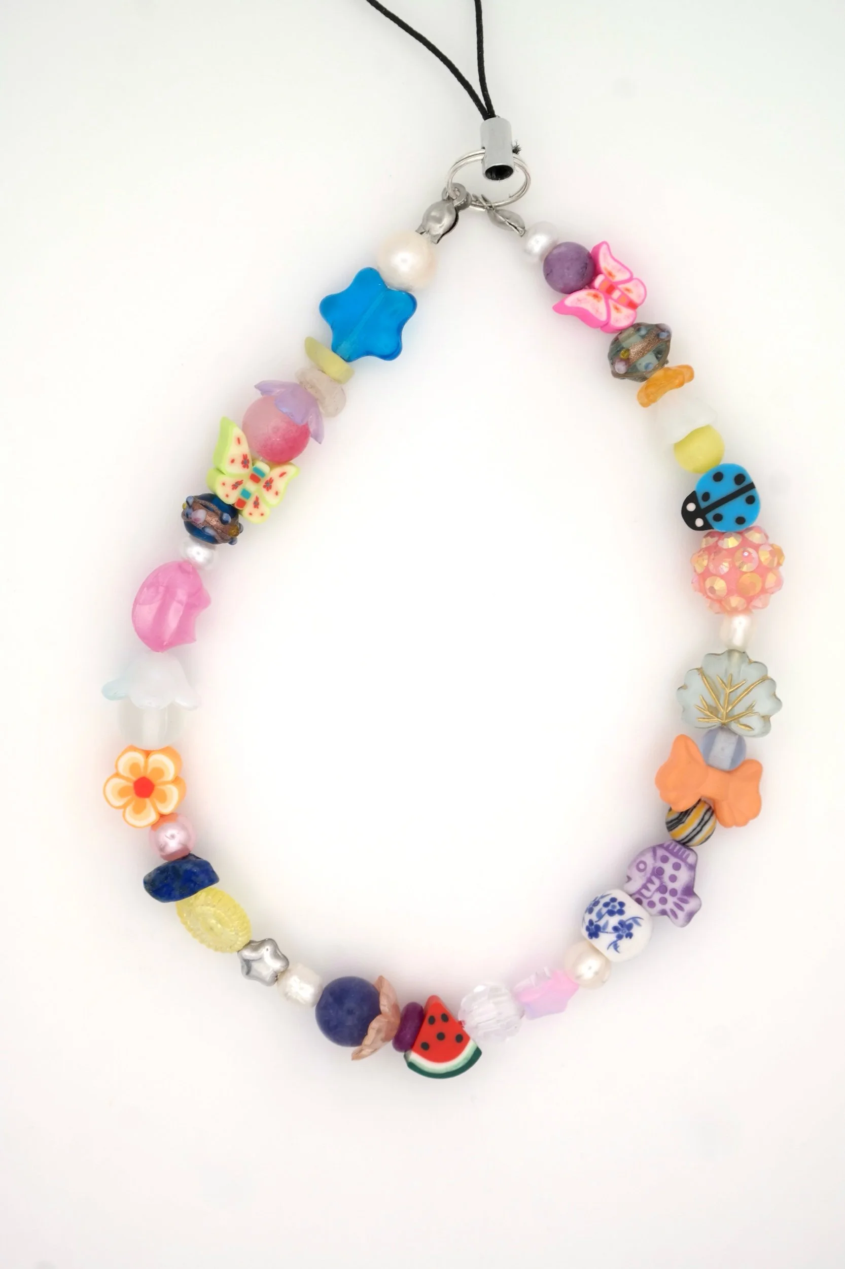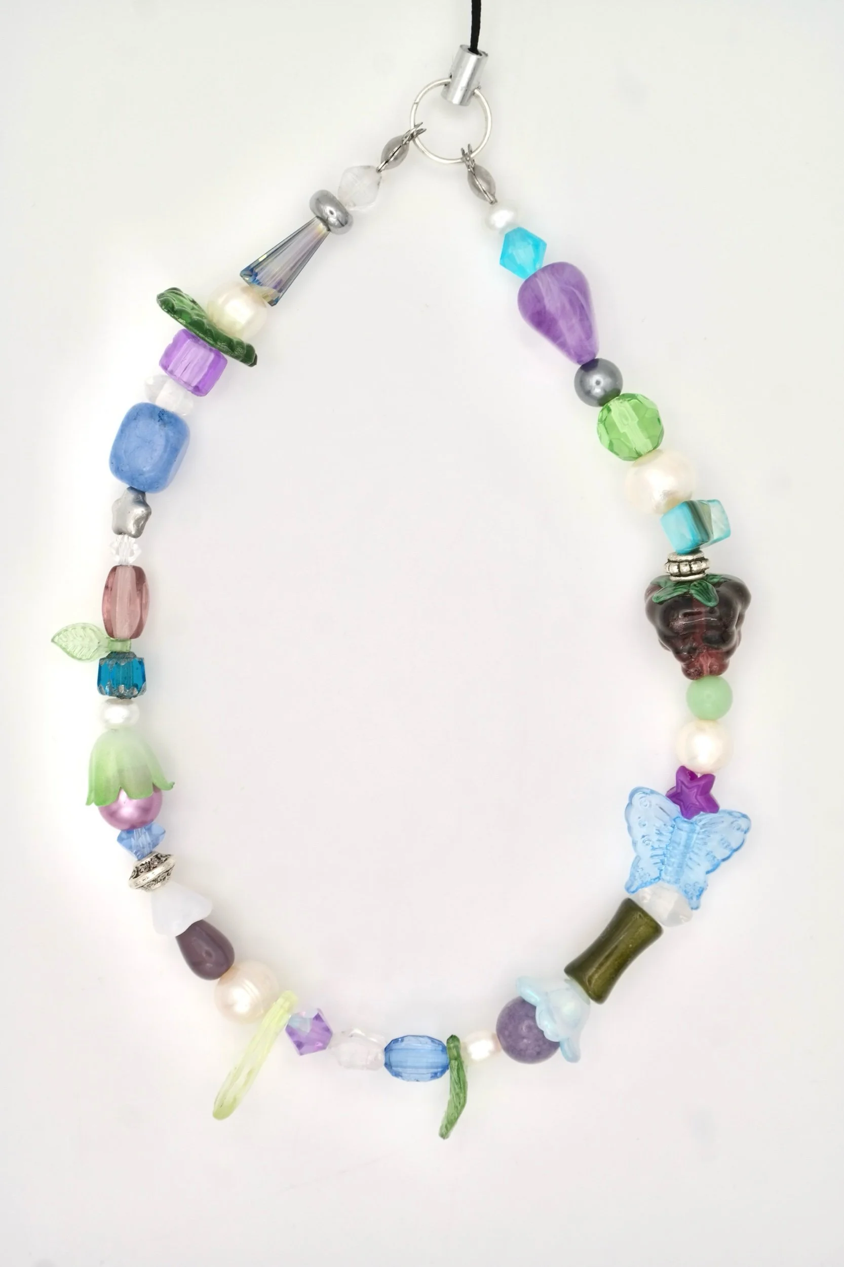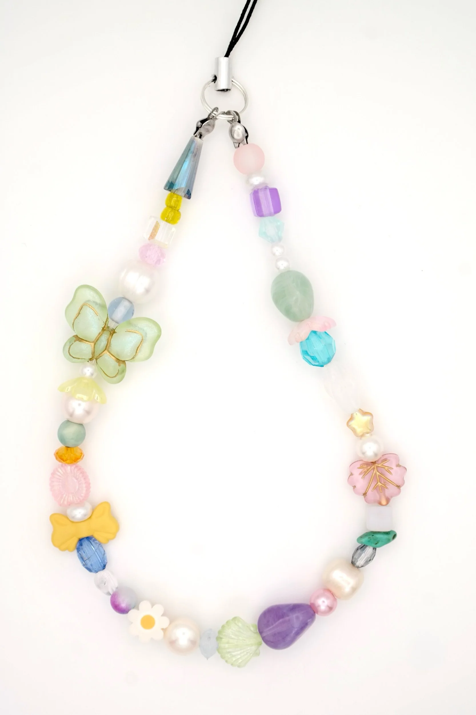 This beaded phone charm is a loop of green beads and pearls, featuring a beautiful glass Chinese cabbage. It hangs from a small black string loop, which can be attached to a phone case. Beads include three daisies, a green fish, a green bow, a green side portrait of a woman, a green heart, a green star, green flowers, and other unique shapes. The details that attach the phone charm together are silver.