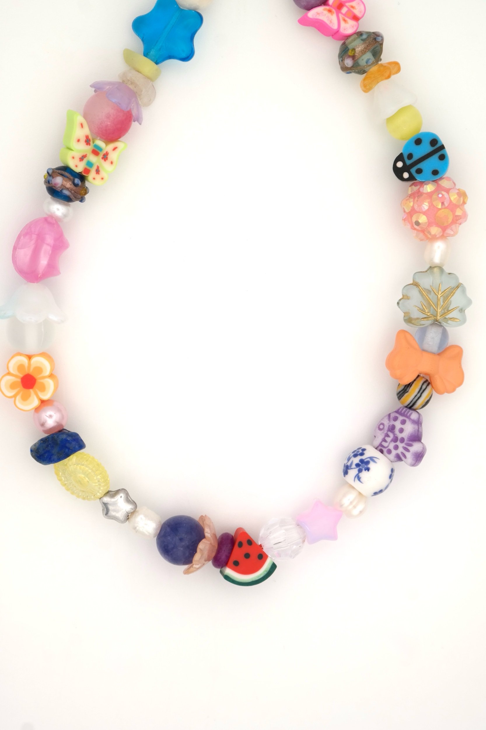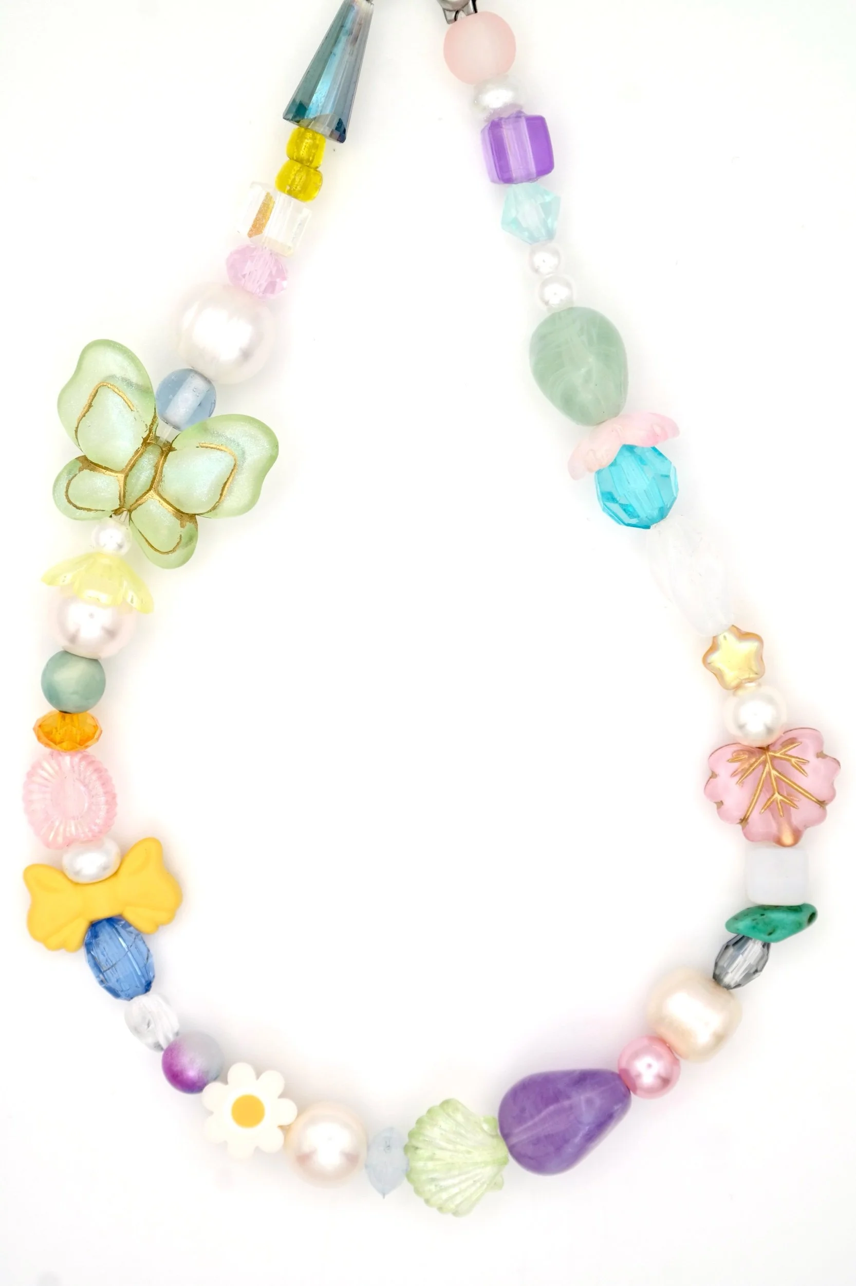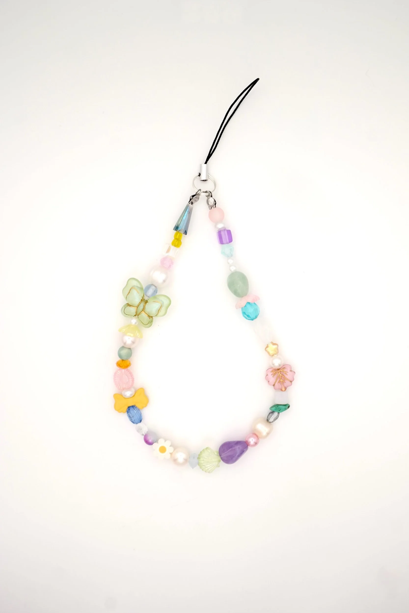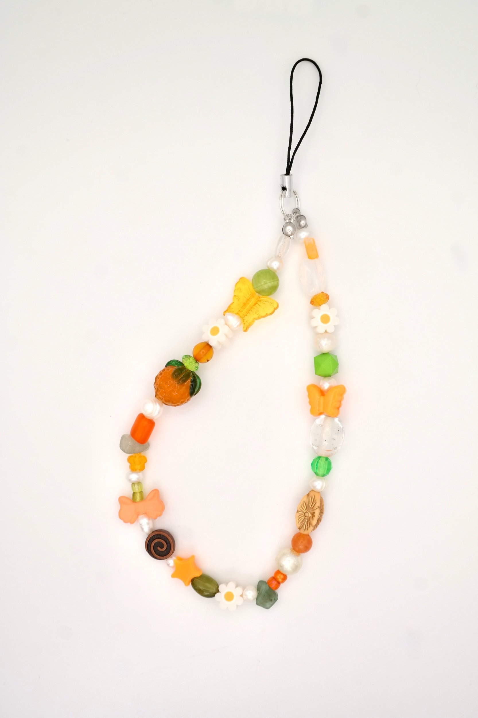 This beaded phone charm is a loop of green beads and pearls, featuring a beautiful glass Chinese cabbage. It hangs from a small black string loop, which can be attached to a phone case. Beads include three daisies, a green fish, a green bow, a green side portrait of a woman, a green heart, a green star, green flowers, and other unique shapes. The details that attach the phone charm together are silver.