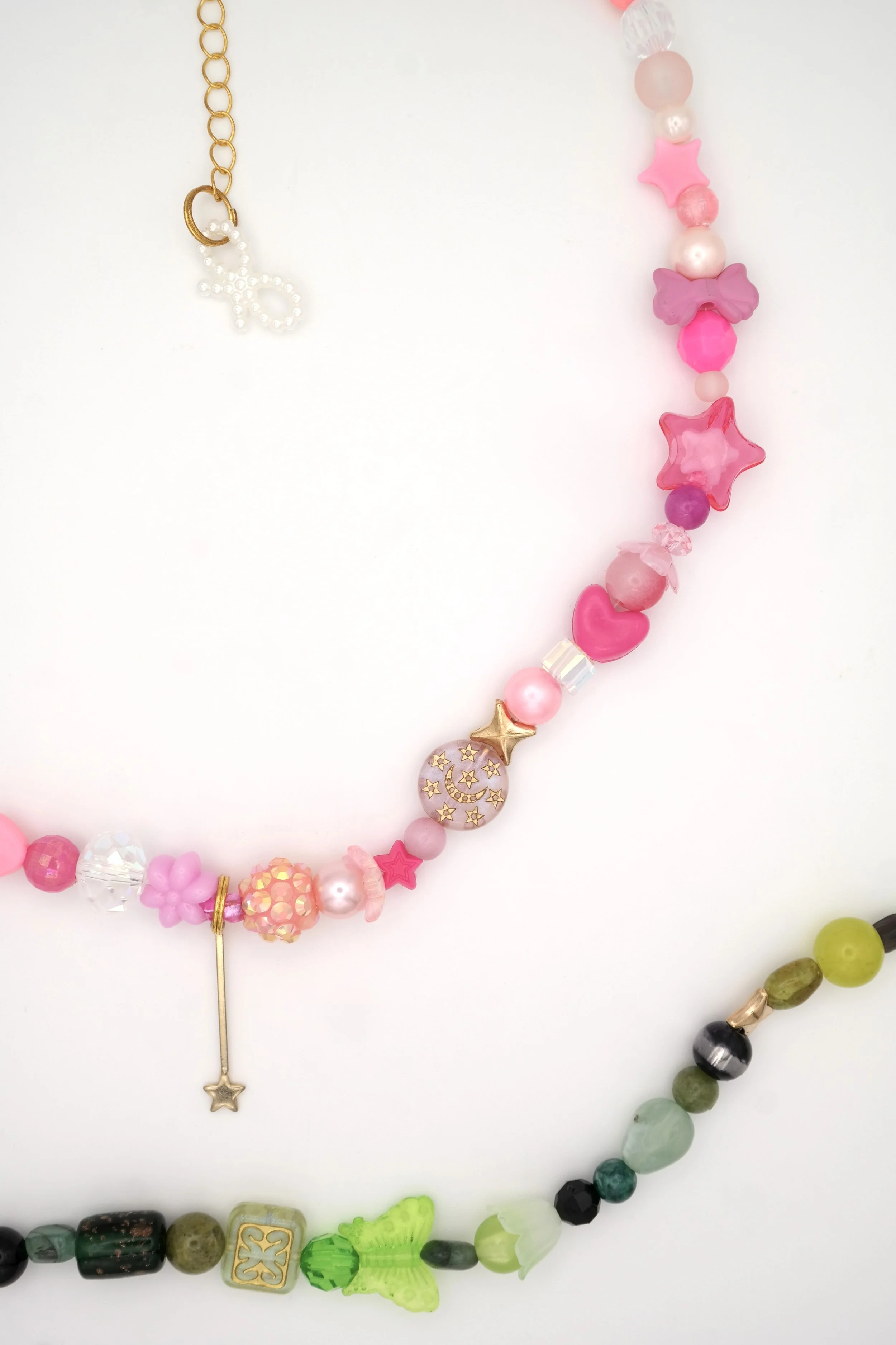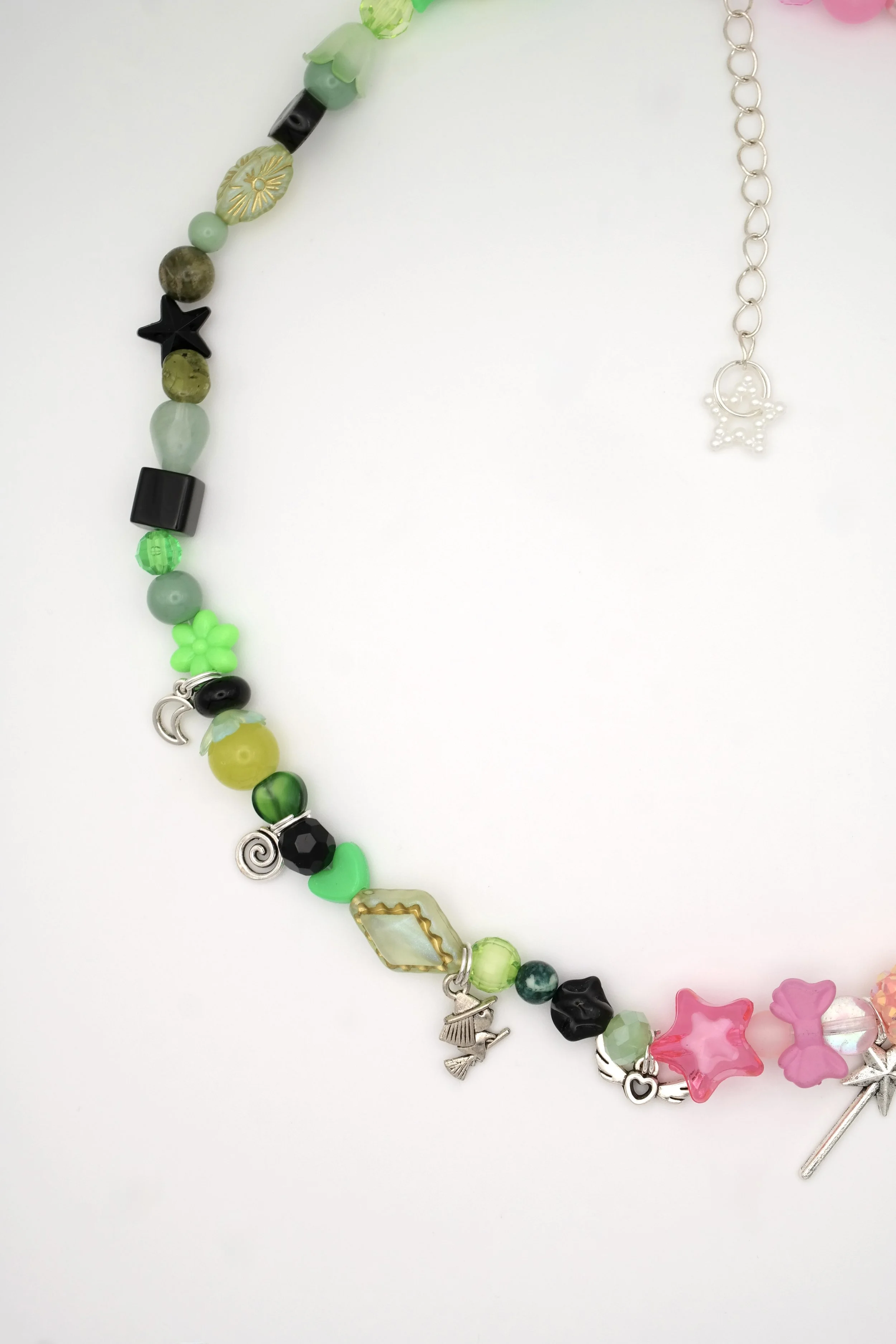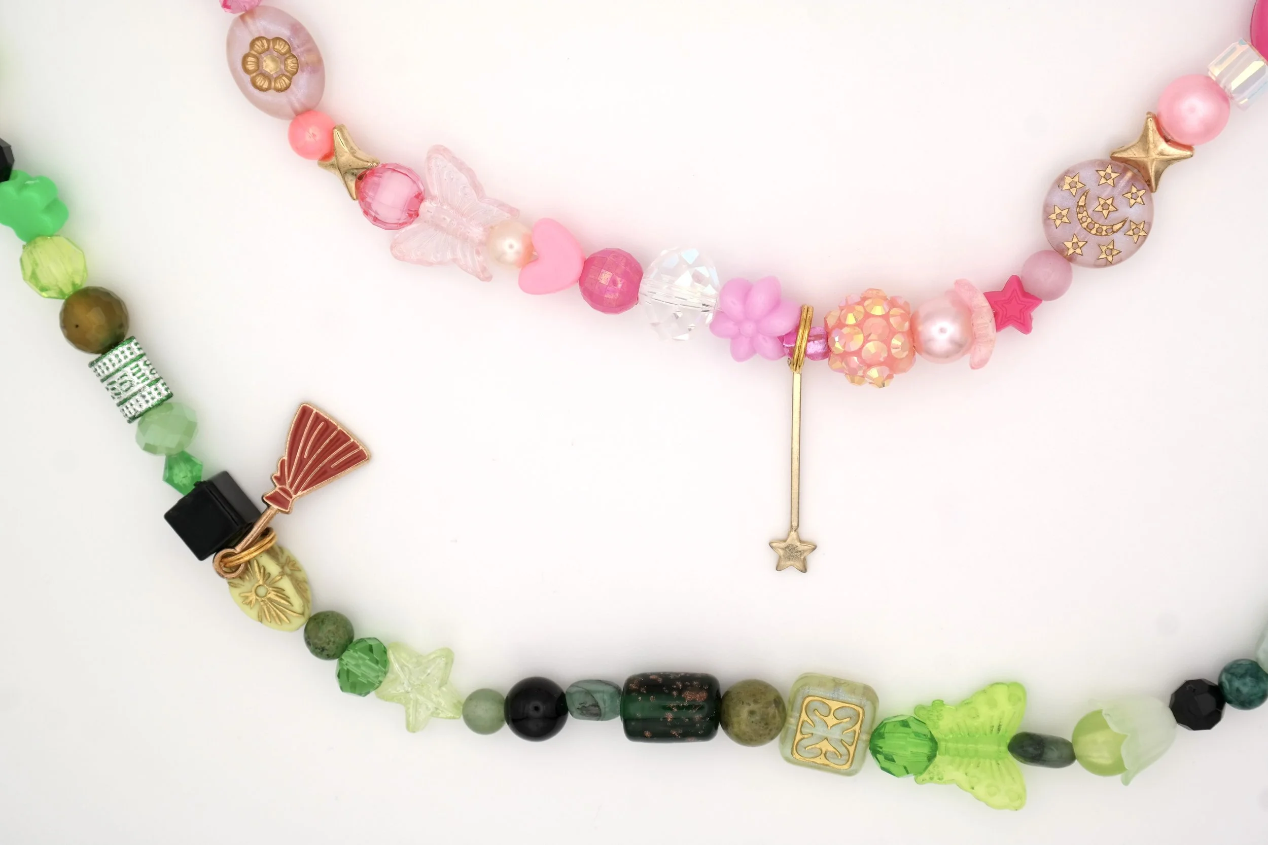 This Wicked-inspired necklace is the perfect piece to celebrate both Elphaba and Glinda. The left (Elphaba) side of the necklace has green and black beads, including stars, butterflies, gemstones, flowers, and more unique shapes. The right (Glinda) side of the necklace has beautiful pink and gold beads, including stars, hearts, gemstones, flowers, butterflies, and more unique shapes. On the Elphie side hangs a green leaf, and on the Glinda side hangs a pink flower petal. There is a silver clasp and a silver chain extender with a pearl star charm at the end.