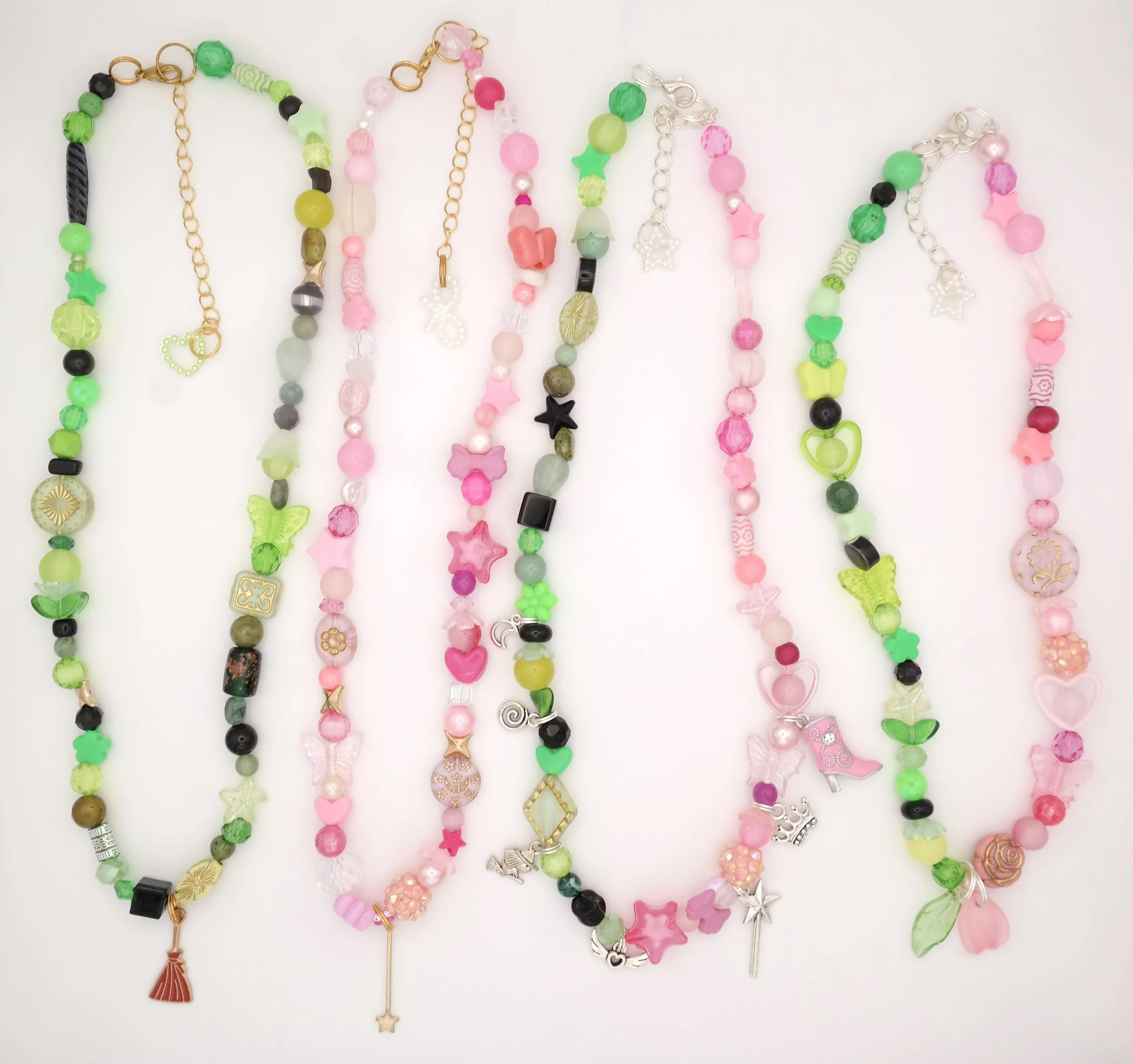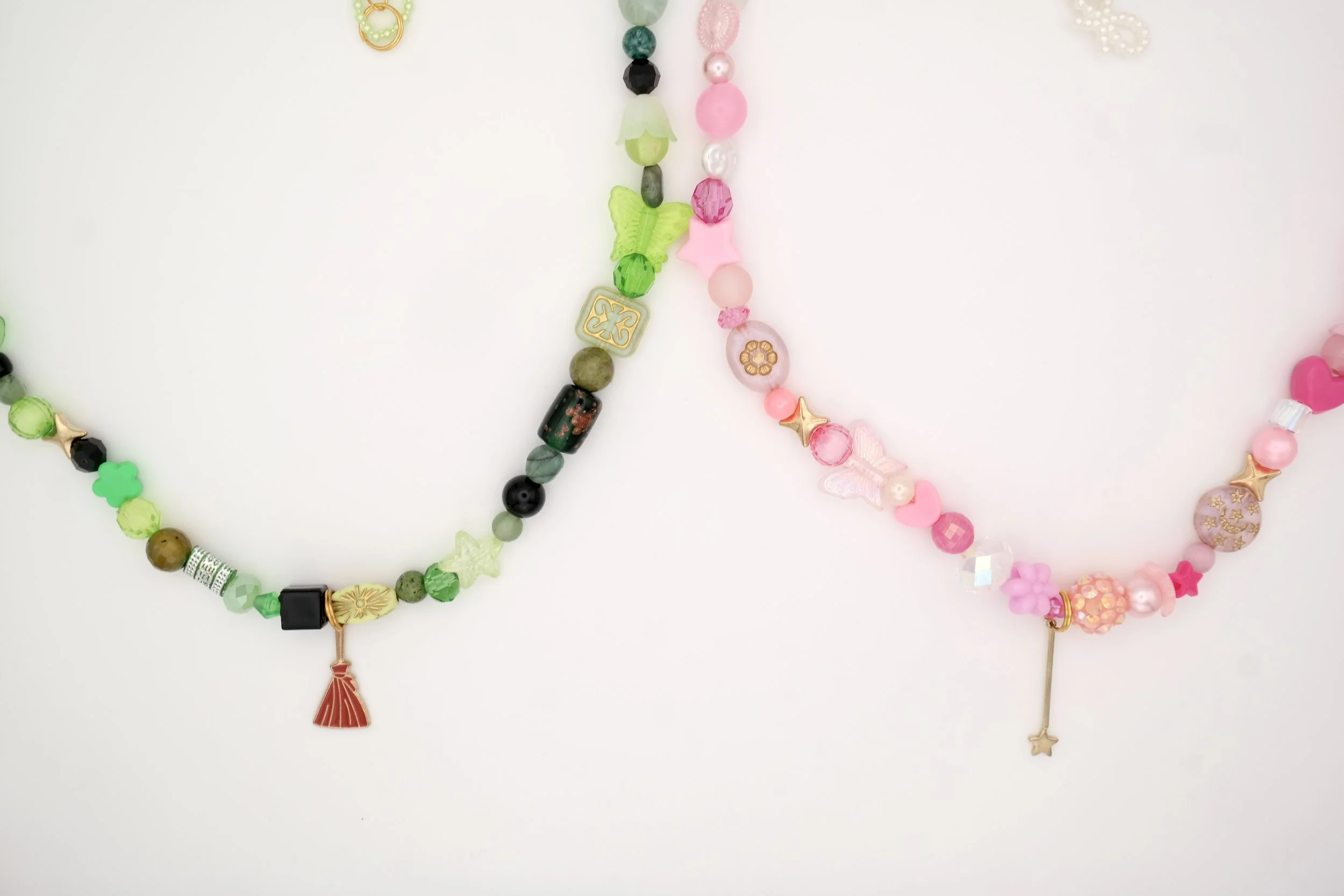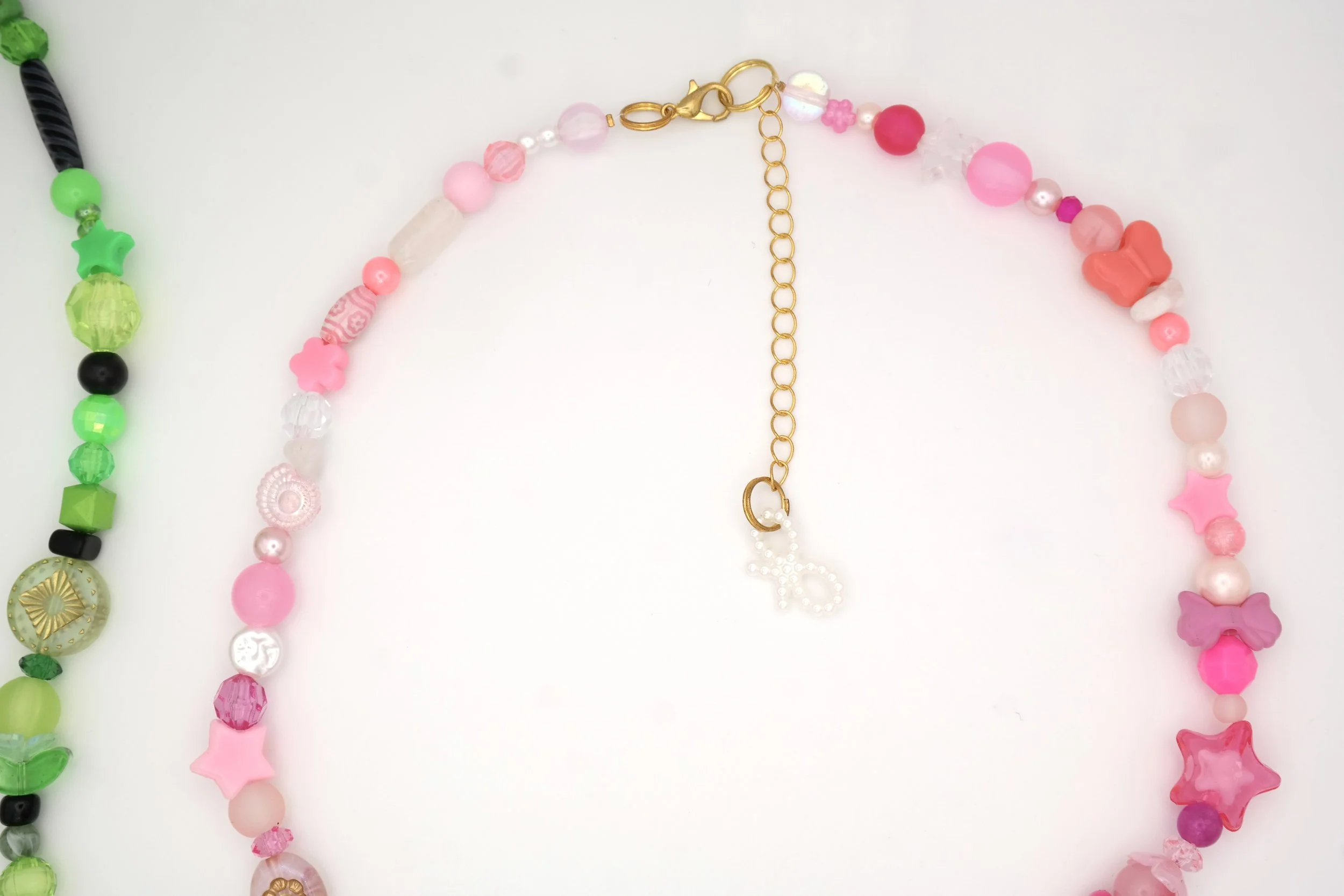 This Wicked-inspired necklace is the perfect piece to celebrate both Elphaba and Glinda. The left (Elphaba) side of the necklace has green and black beads, including stars, butterflies, gemstones, flowers, and more unique shapes. The right (Glinda) side of the necklace has beautiful pink and gold beads, including stars, hearts, gemstones, flowers, butterflies, and more unique shapes. On the Elphie side hangs a green leaf, and on the Glinda side hangs a pink flower petal. There is a silver clasp and a silver chain extender with a pearl star charm at the end.