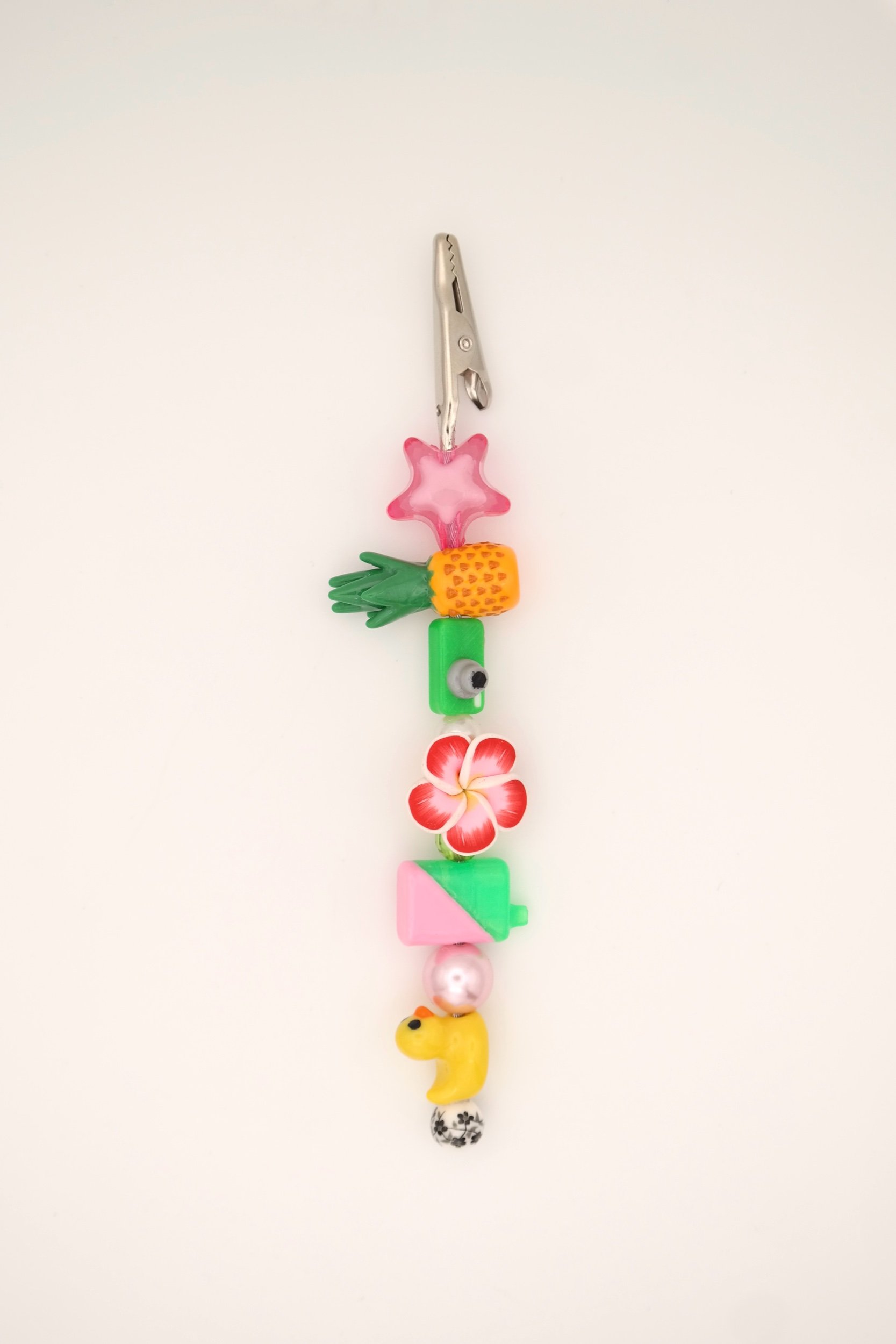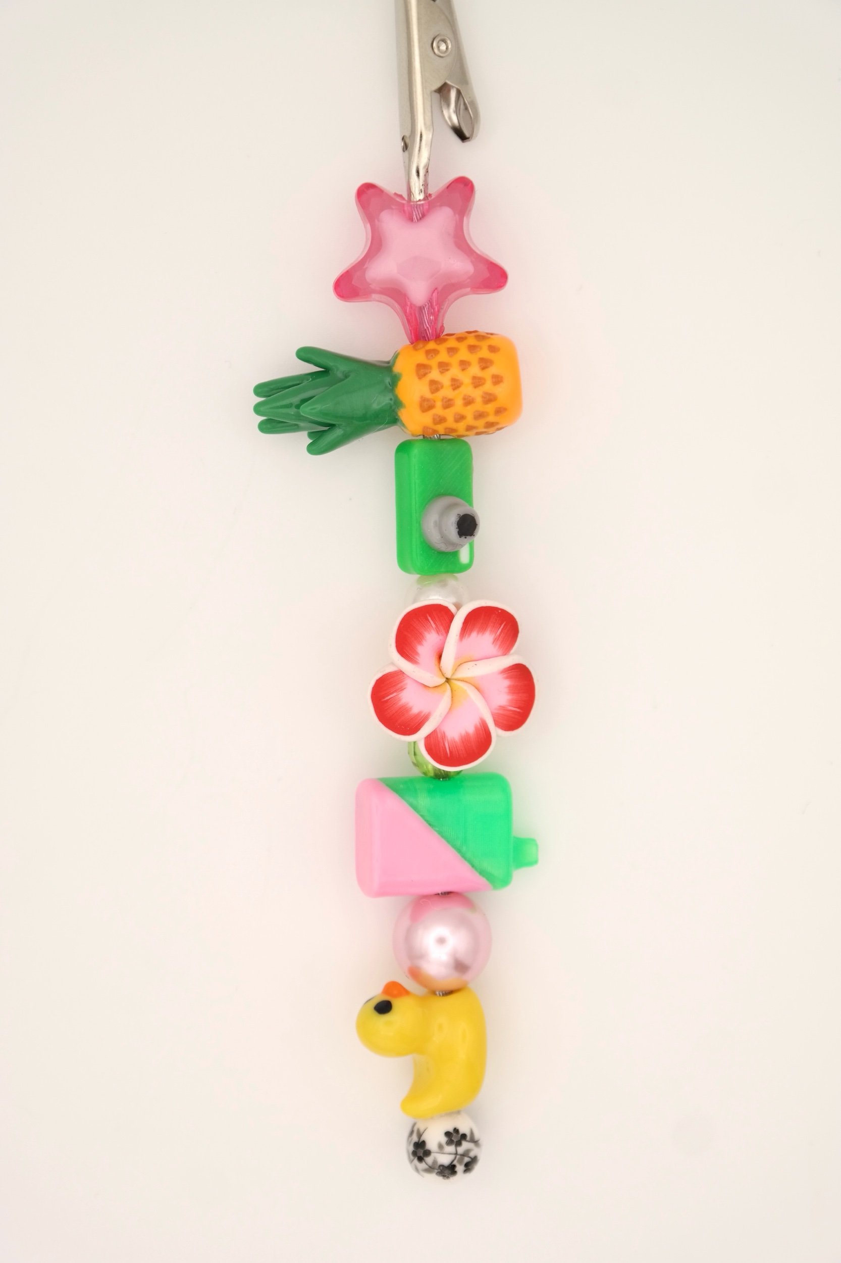 I do believe Zara Larsson would smoke a J with this… This beaded roach clip is stacked with a big pink star, a pineapple, a green camera, a pearl, a pink hibiscus, a pink and green vape, a pink pearl, a rubber ducky, and a white bead with a pattern of black flowers. Perfect for your summer smoke sessions!!