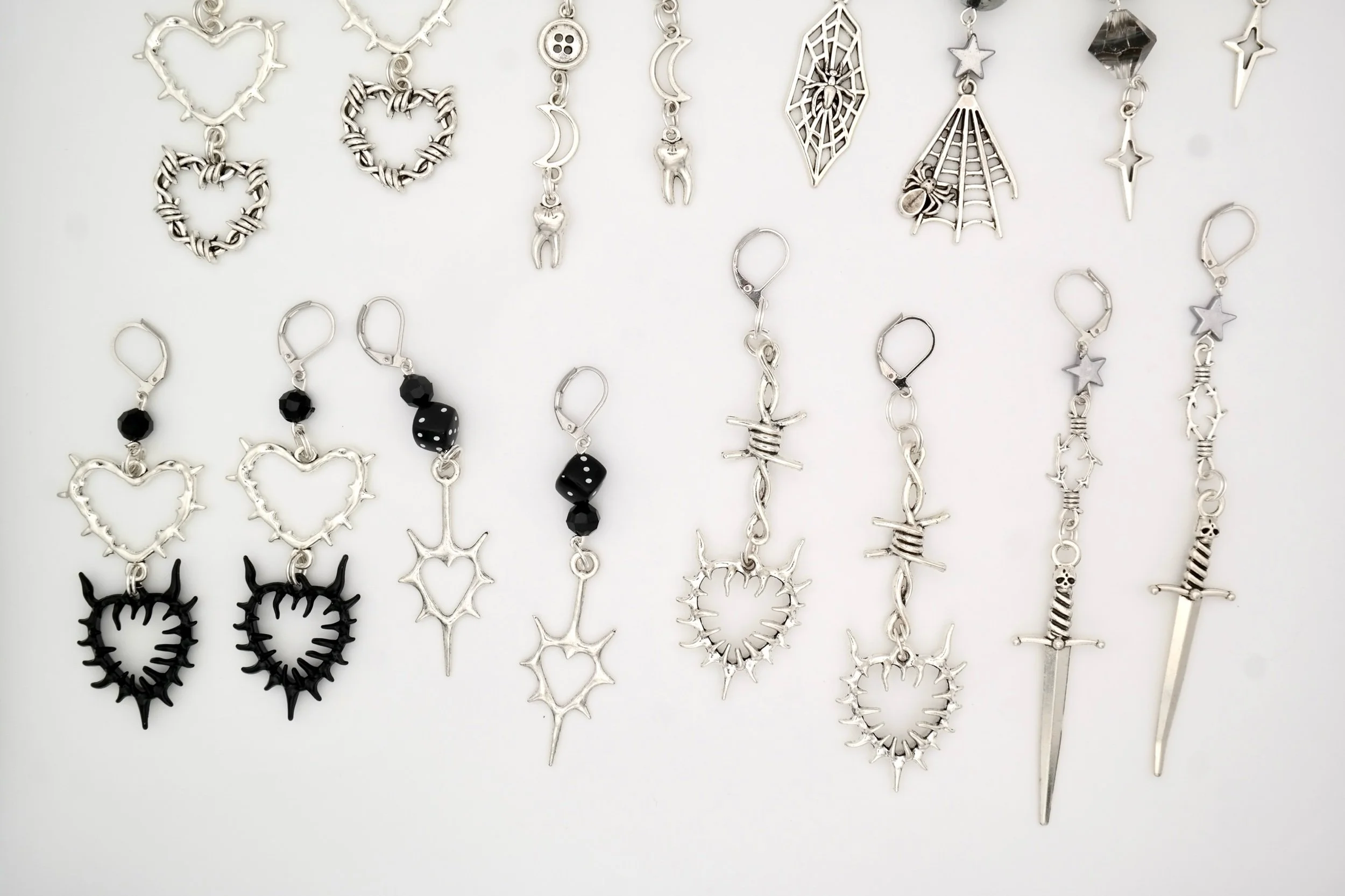 These earrings are the perfect addition to a witch’s collection. These earrings hang small black gems, silver spiky heart charms, and spiky black heart charms at the end. The silver earring hooks clip in the back to be secured.