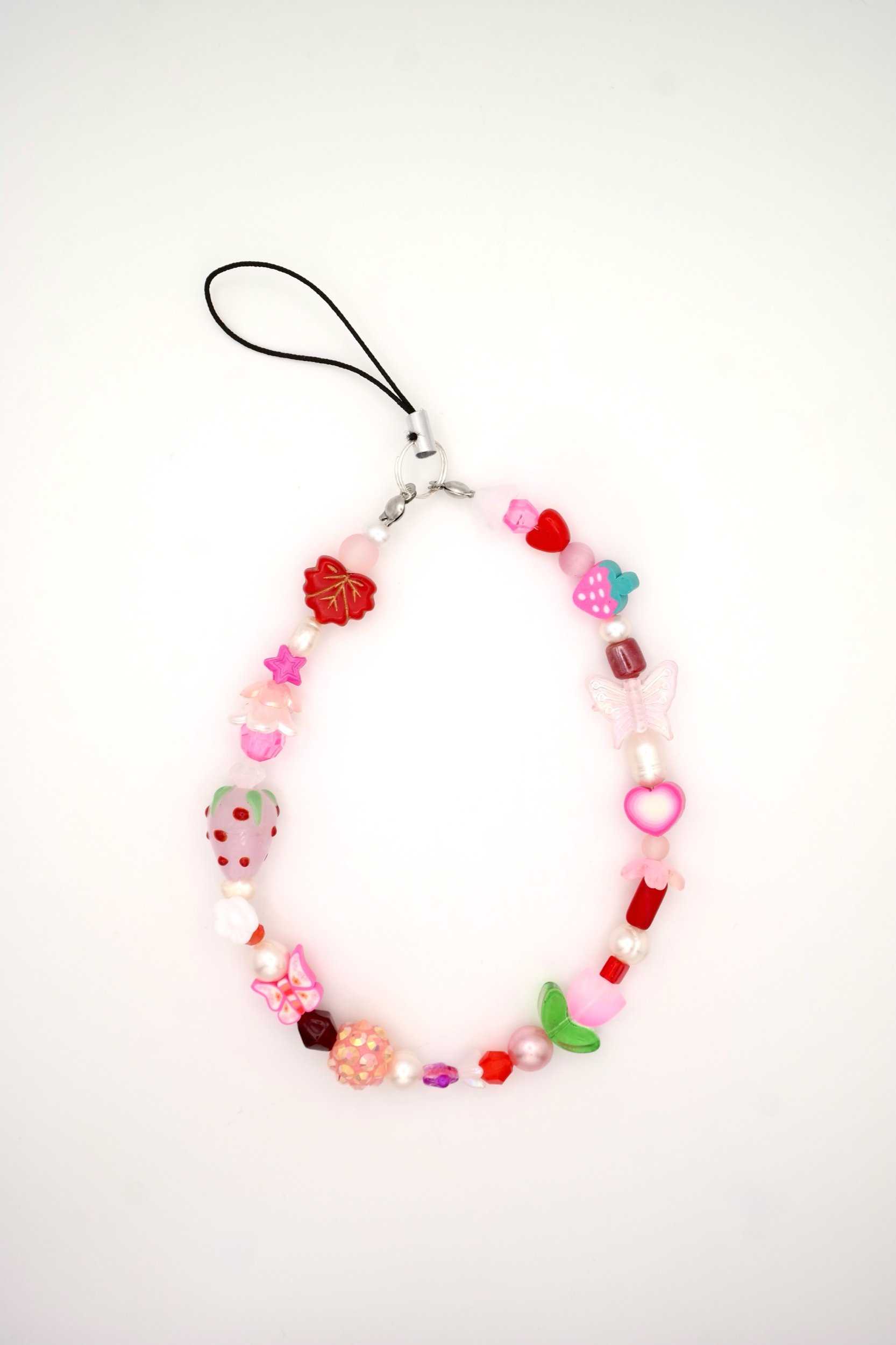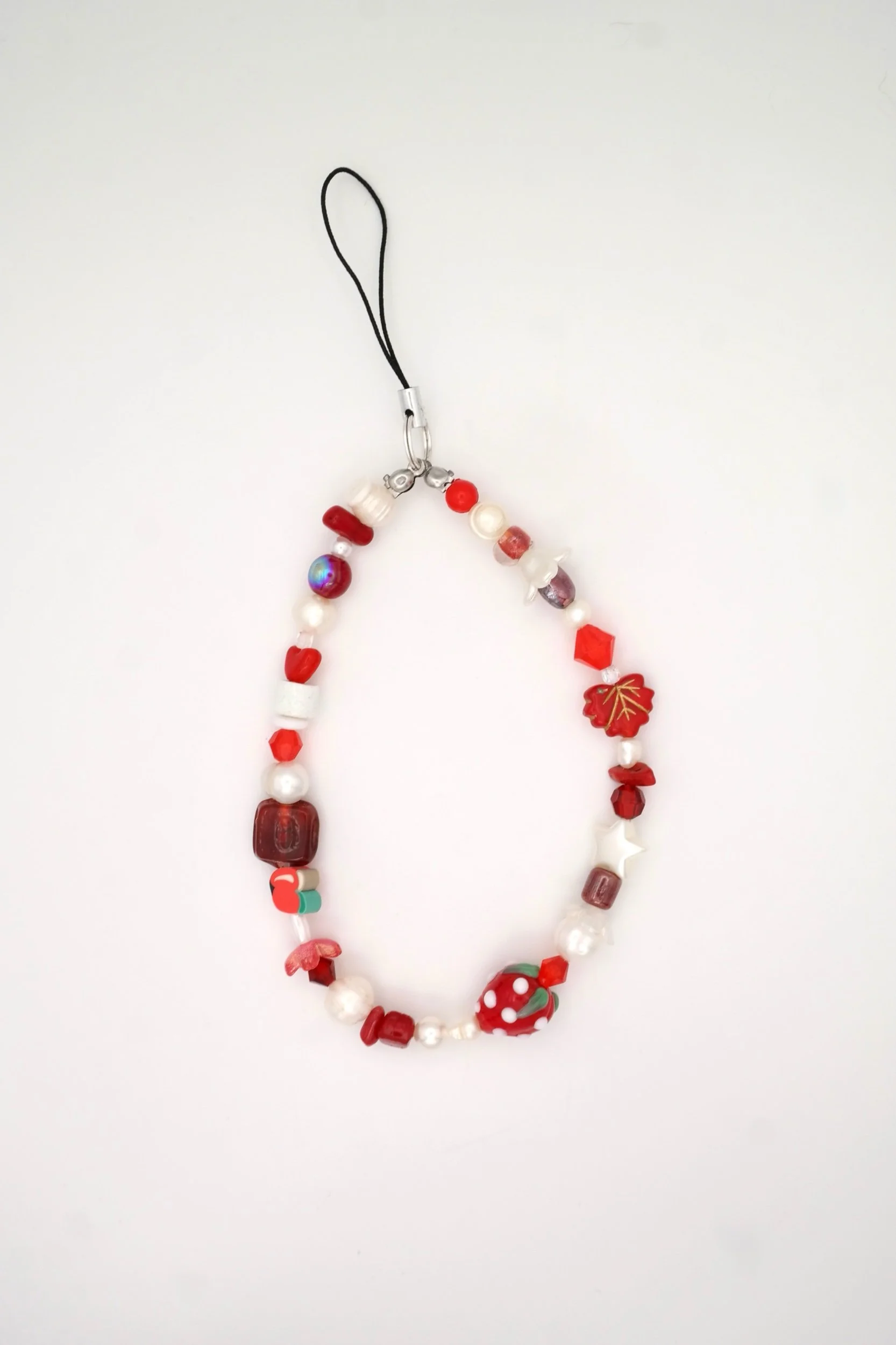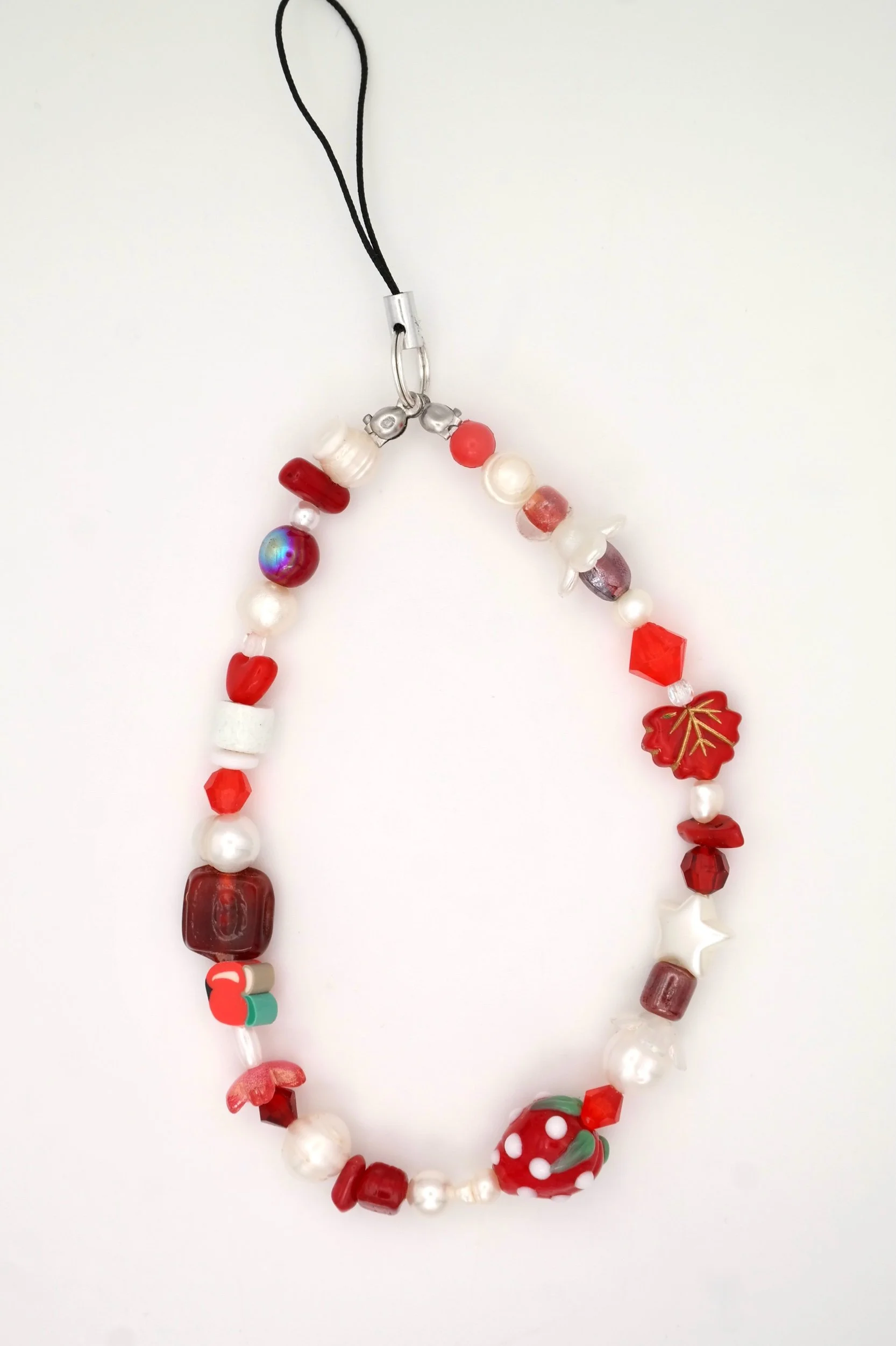 This beaded phone charm is a loop of red beads and pearls, featuring a beautiful glass strawberry. It hangs from a small black string loop, which can be attached to a phone case. Beads include a red leaf, an apple, flowers, a pearl star, a red heart, and other unique shapes. The details that attach the phone charm together are silver.