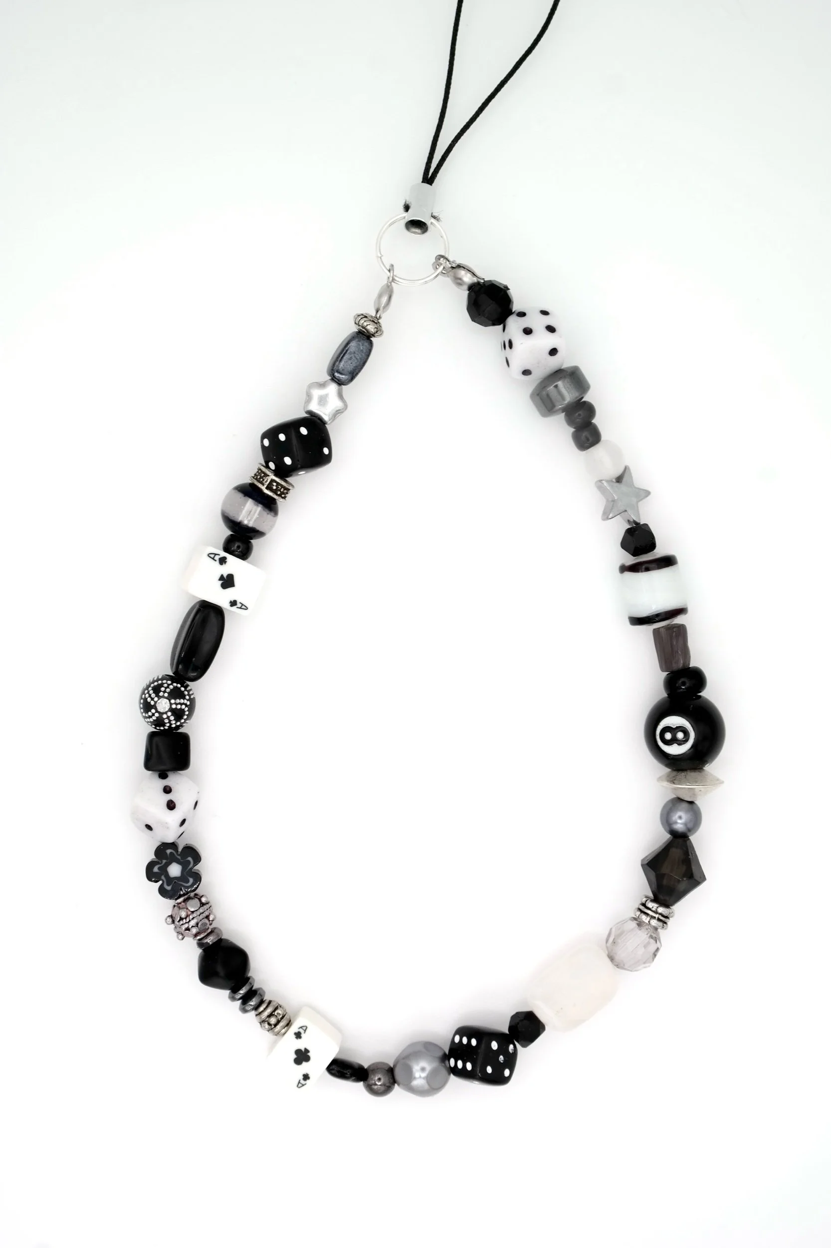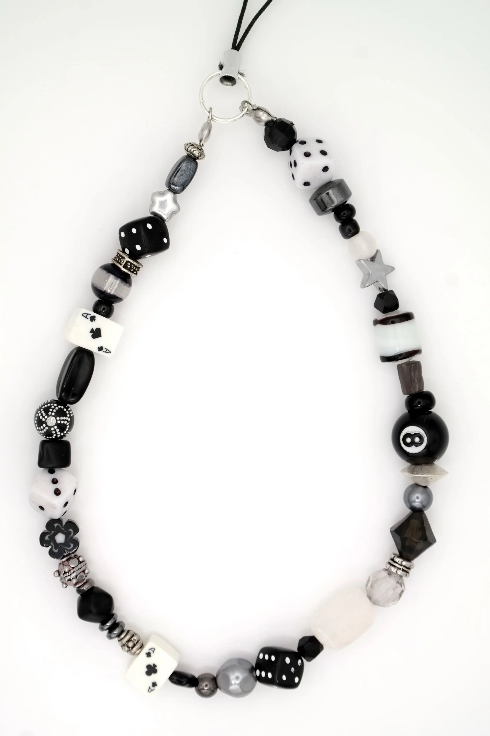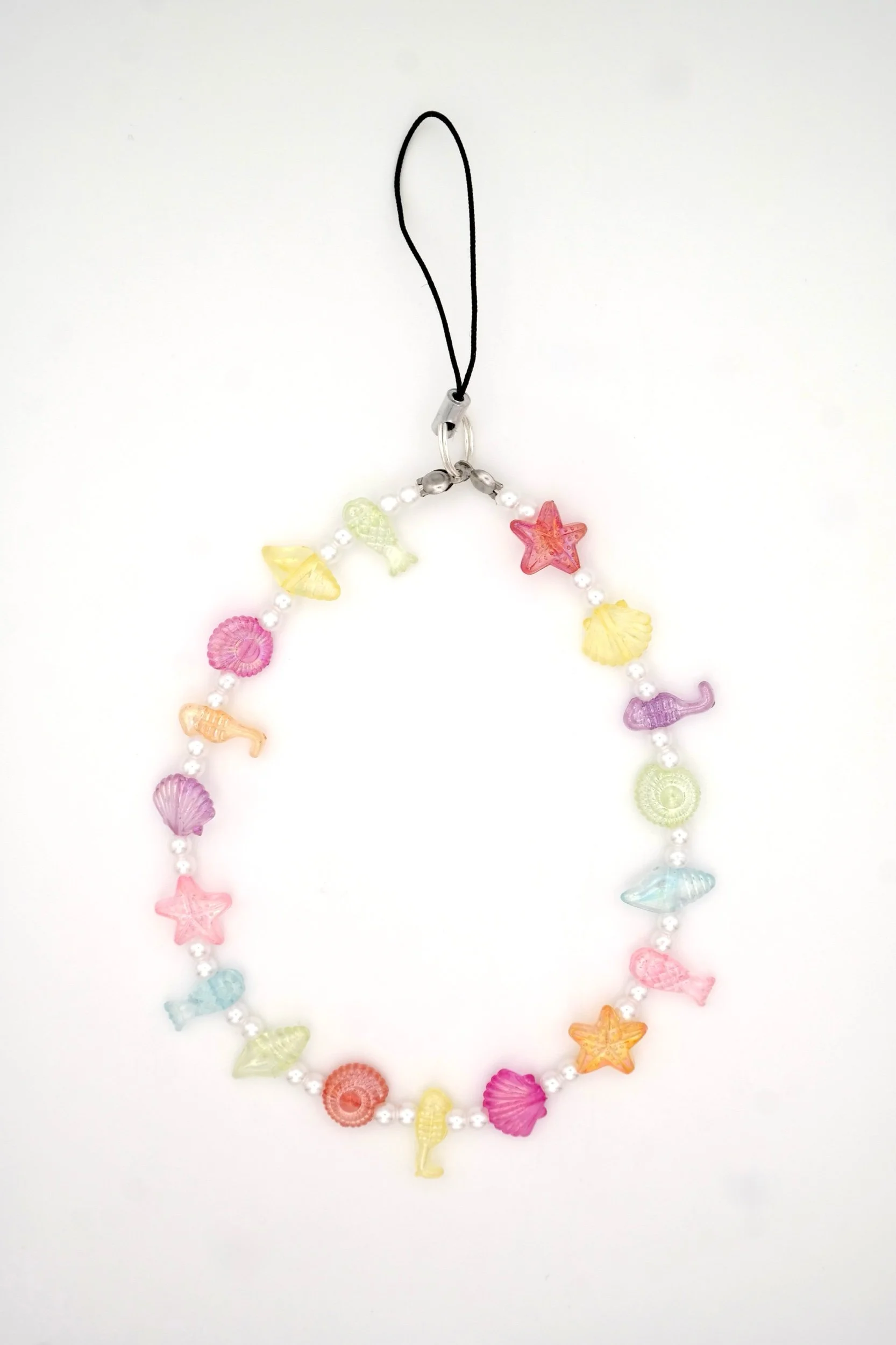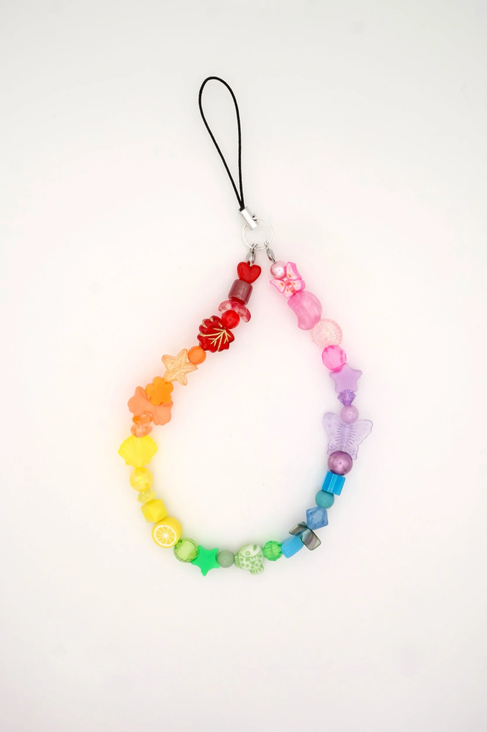 This beaded phone charm is a loop of red beads and pearls, featuring a beautiful glass strawberry. It hangs from a small black string loop, which can be attached to a phone case. Beads include a red leaf, an apple, flowers, a pearl star, a red heart, and other unique shapes. The details that attach the phone charm together are silver.