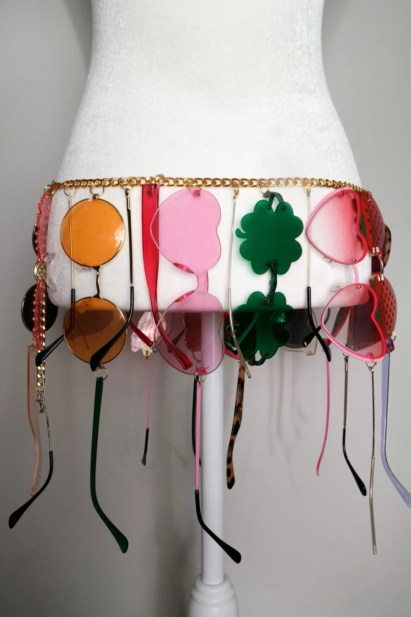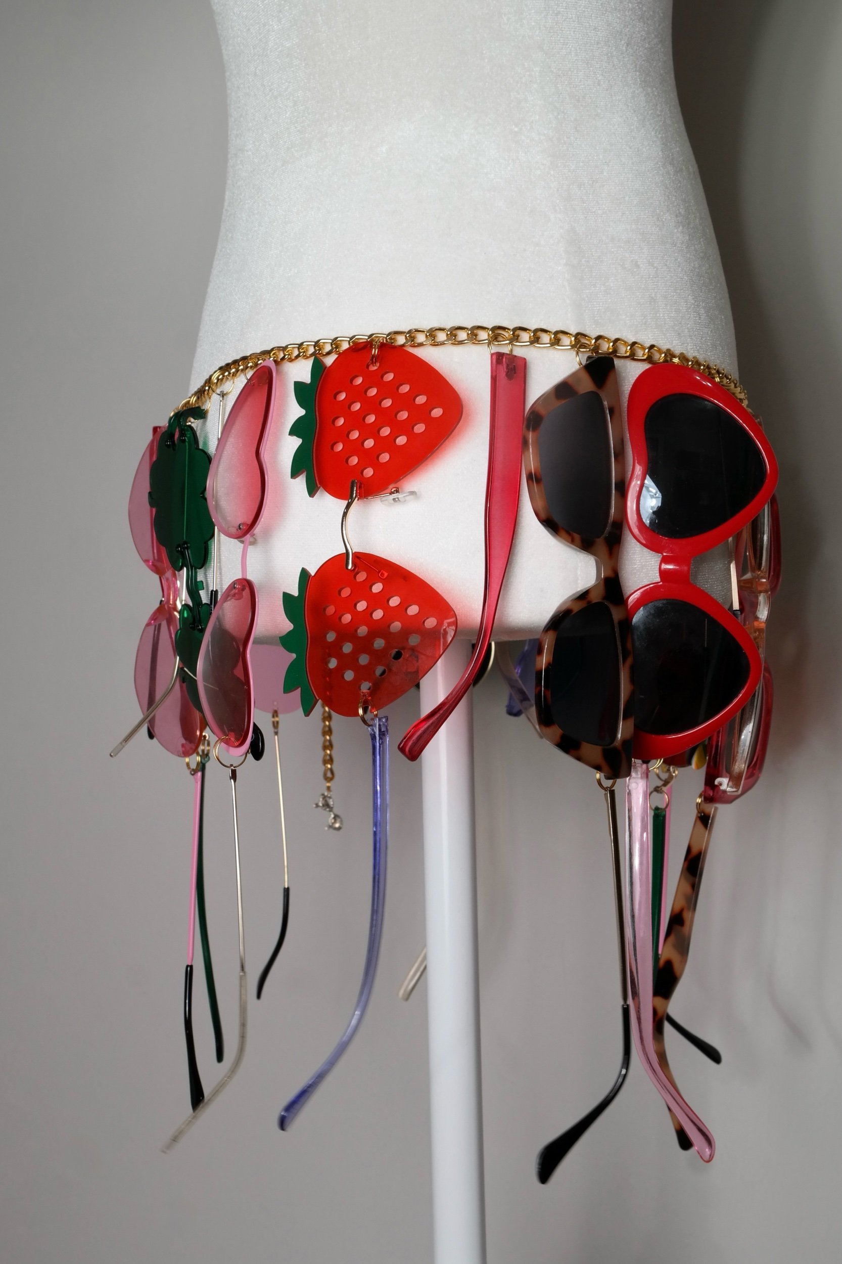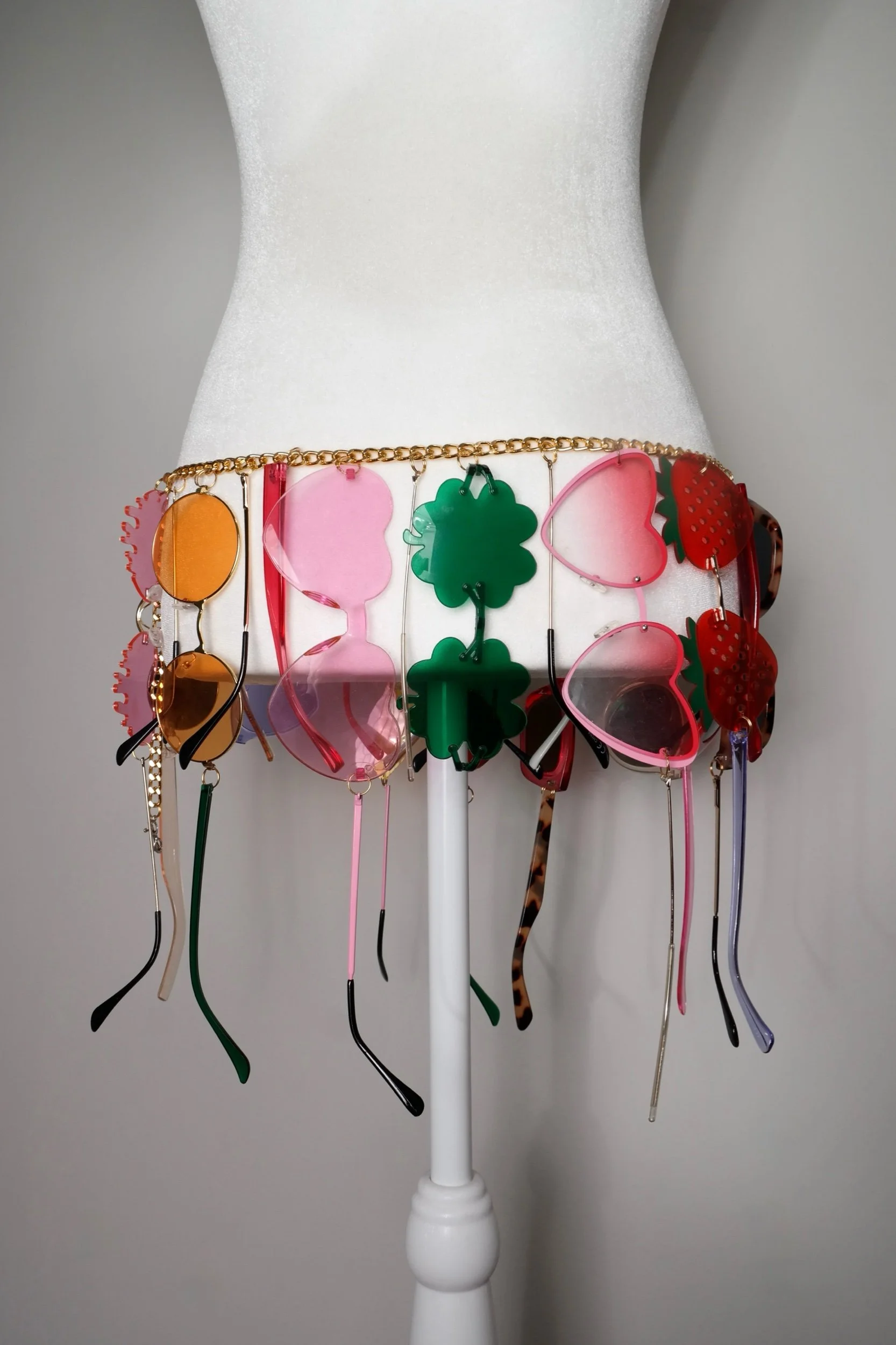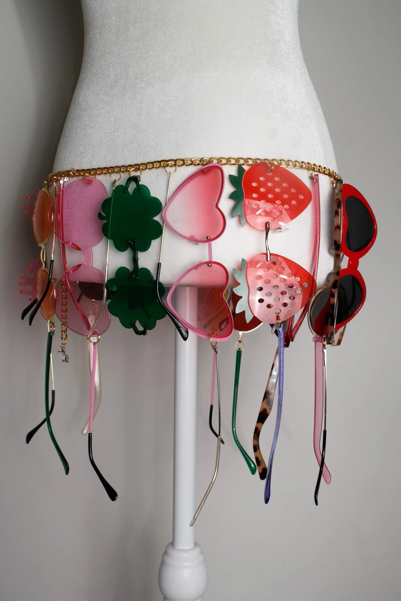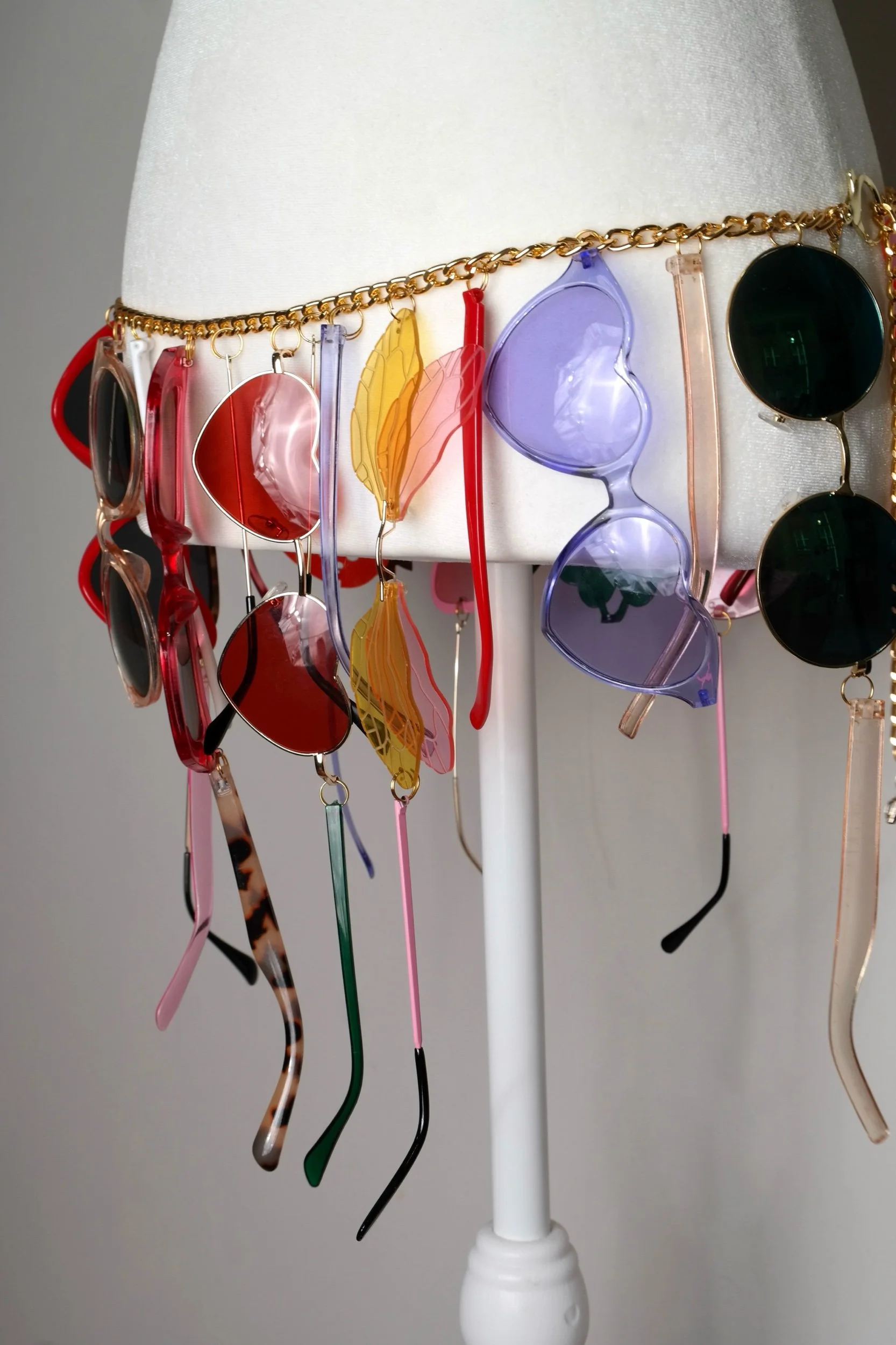 This gold waist chain hangs colorful sunglasses of different styles and lots of glasses arms. Sunglasses styles include a number of different heart shapes, rectangles, circles, butterflies, strawberries, and clovers. The piece is campy and fun and can be worn as a skirt perfect for maximalist layering. It measures approximately 39” from end to end. The end of the chain hangs a small silver glasses charm.