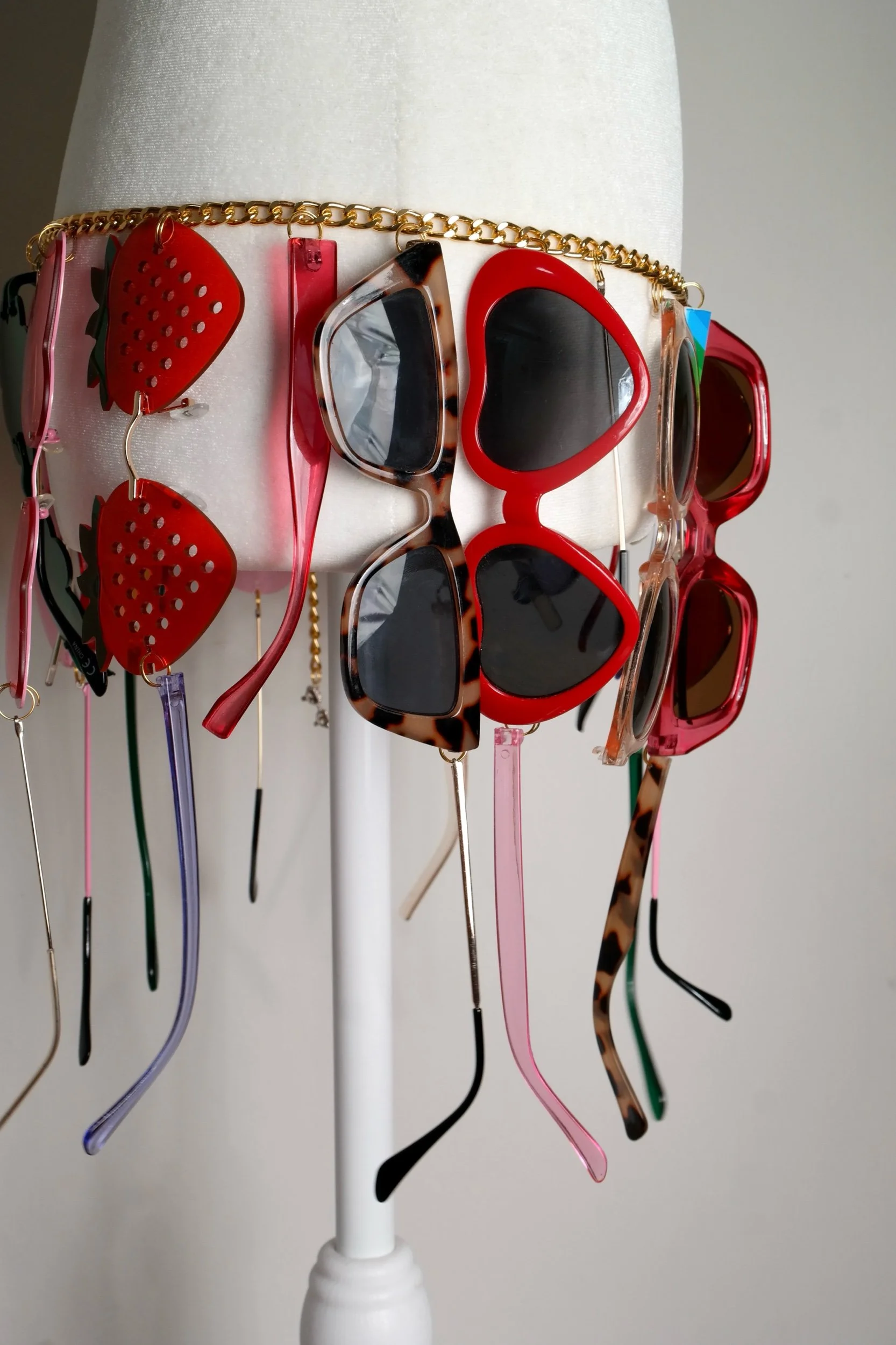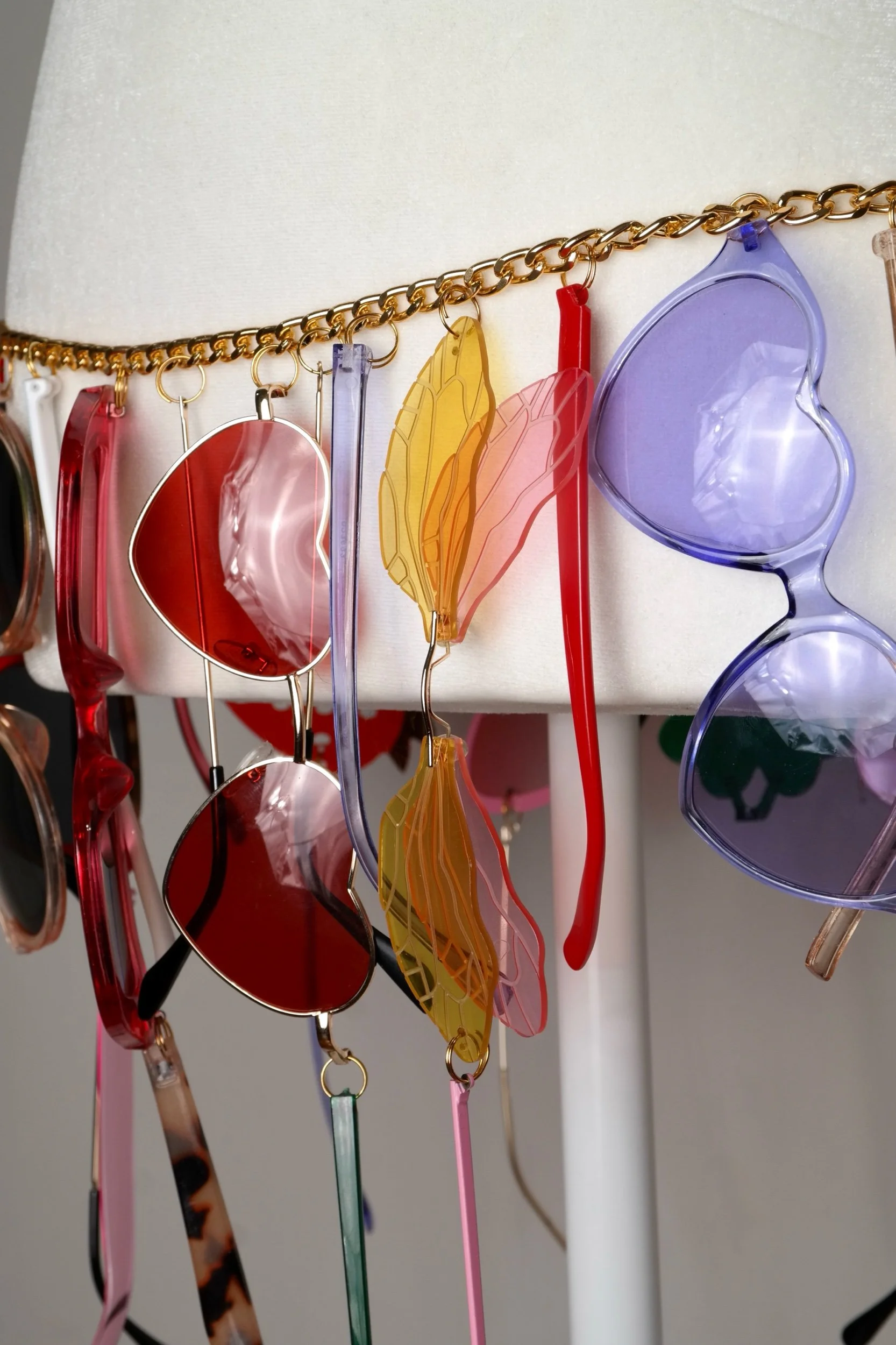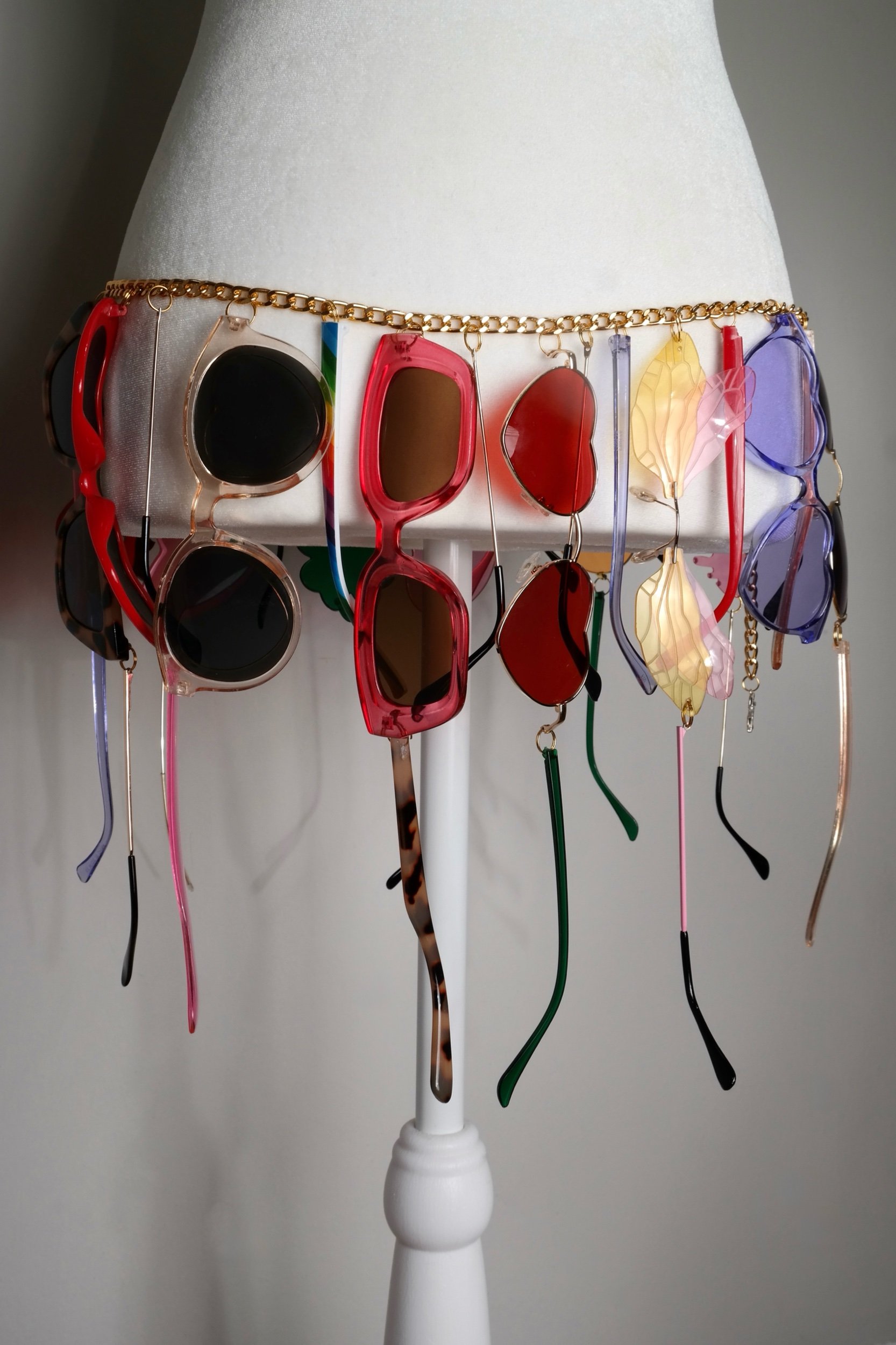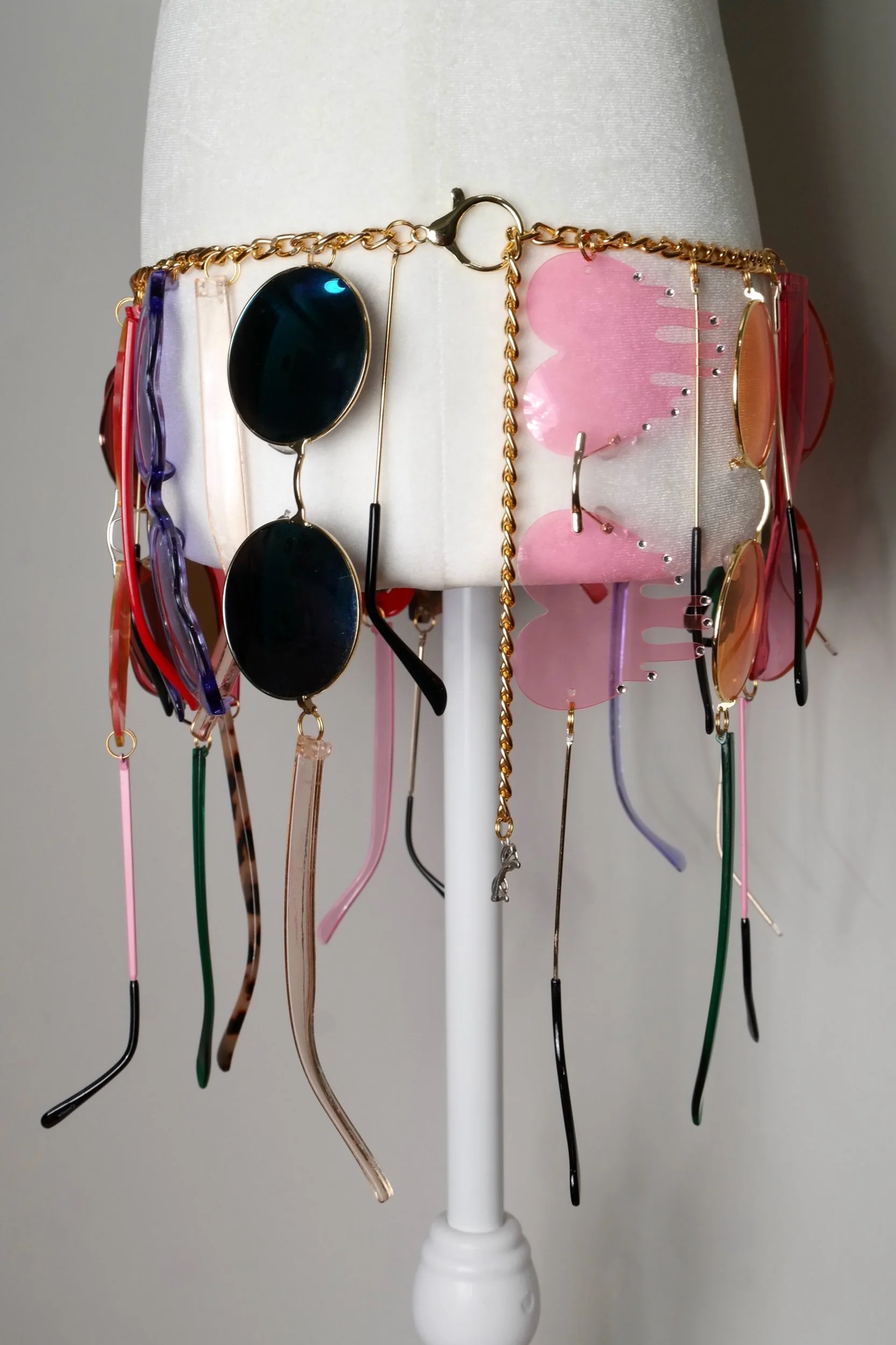 This gold waist chain hangs colorful sunglasses of different styles and lots of glasses arms. Sunglasses styles include a number of different heart shapes, rectangles, circles, butterflies, strawberries, and clovers. The piece is campy and fun and can be worn as a skirt perfect for maximalist layering. It measures approximately 39” from end to end. The end of the chain hangs a small silver glasses charm.