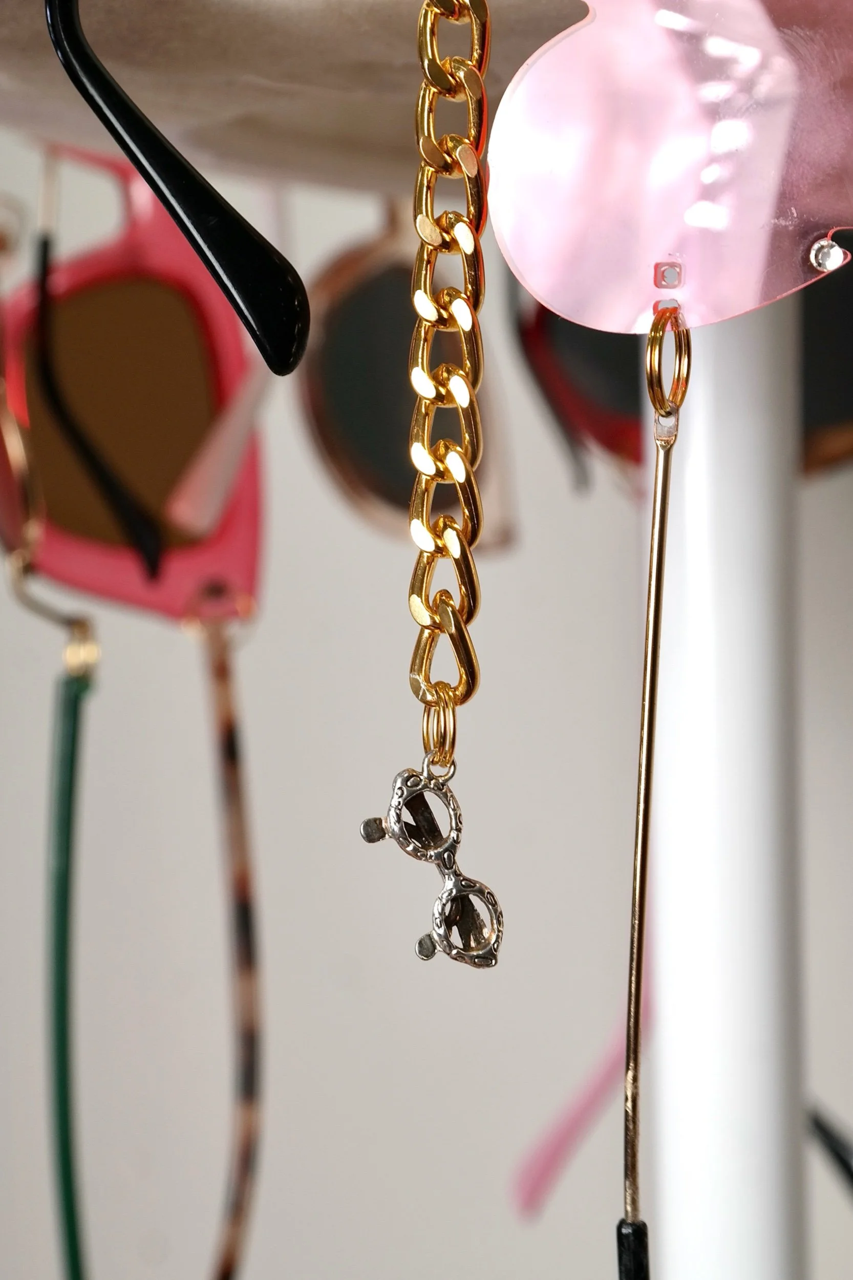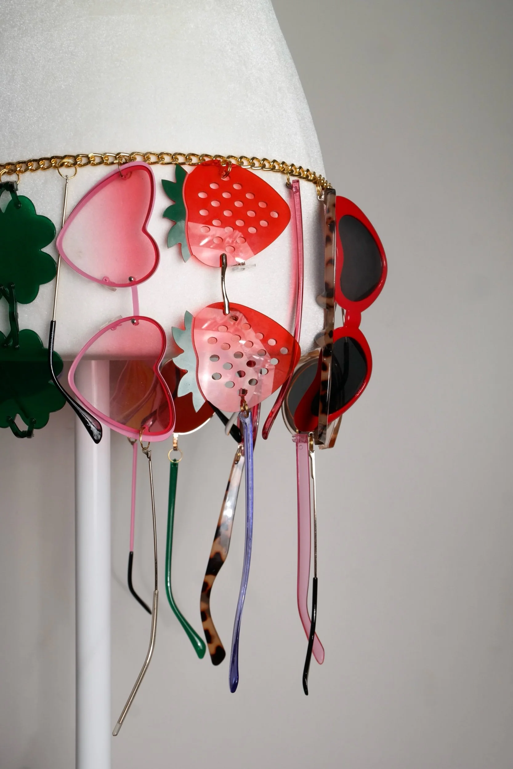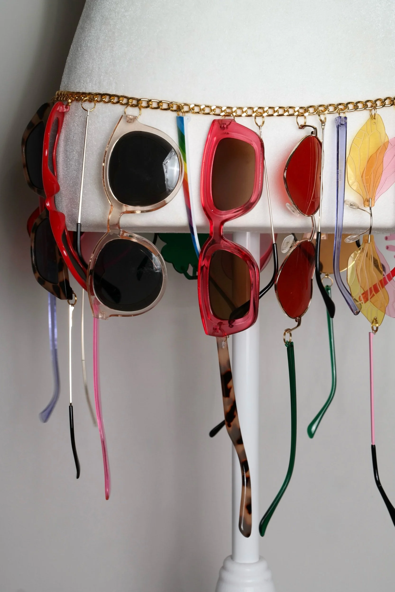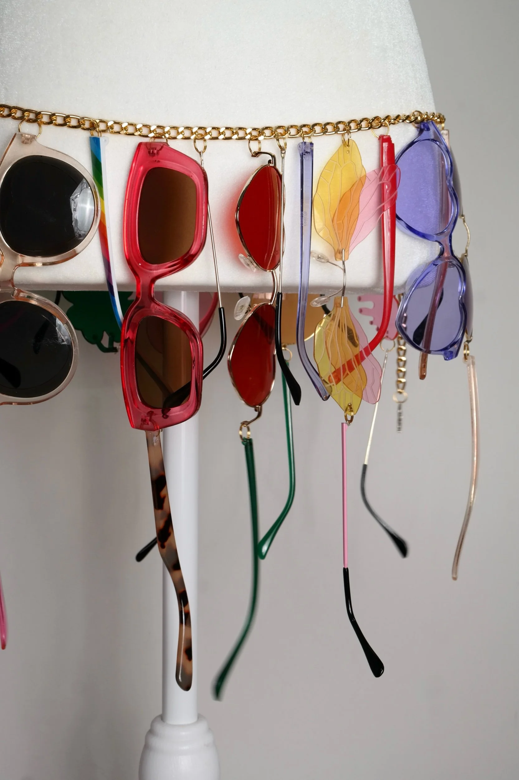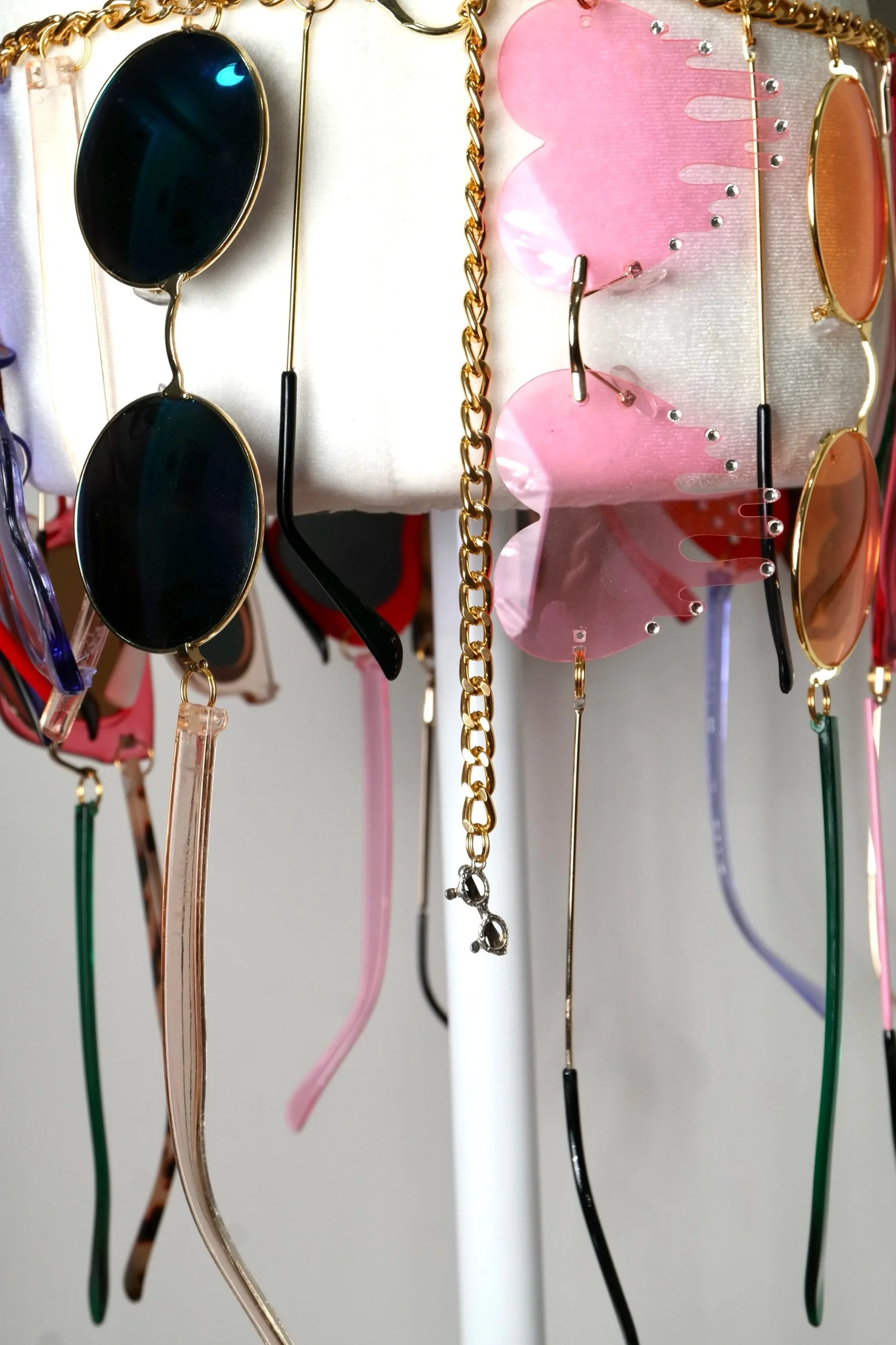 This gold waist chain hangs colorful sunglasses of different styles and lots of glasses arms. Sunglasses styles include a number of different heart shapes, rectangles, circles, butterflies, strawberries, and clovers. The piece is campy and fun and can be worn as a skirt perfect for maximalist layering. It measures approximately 39” from end to end. The end of the chain hangs a small silver glasses charm.