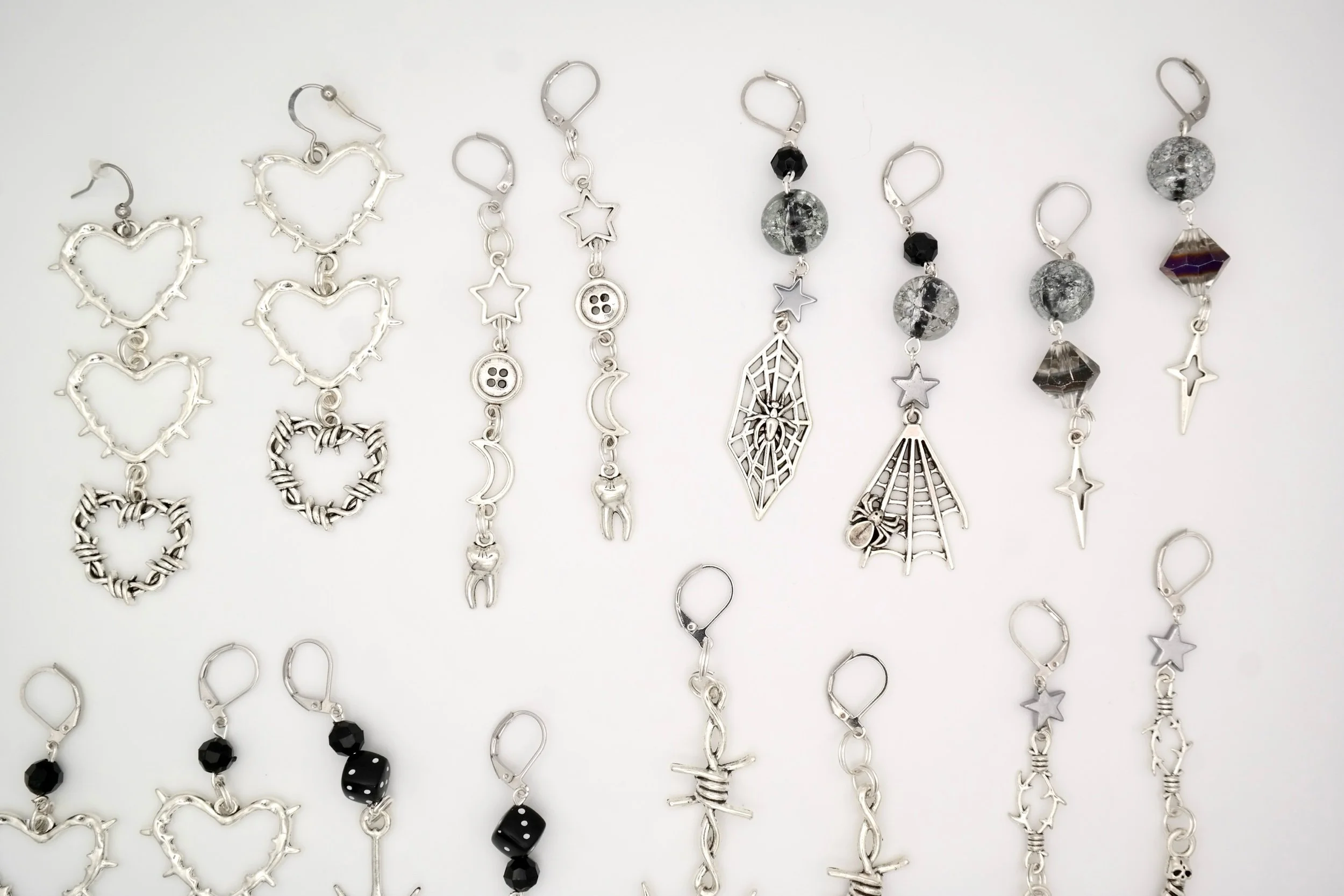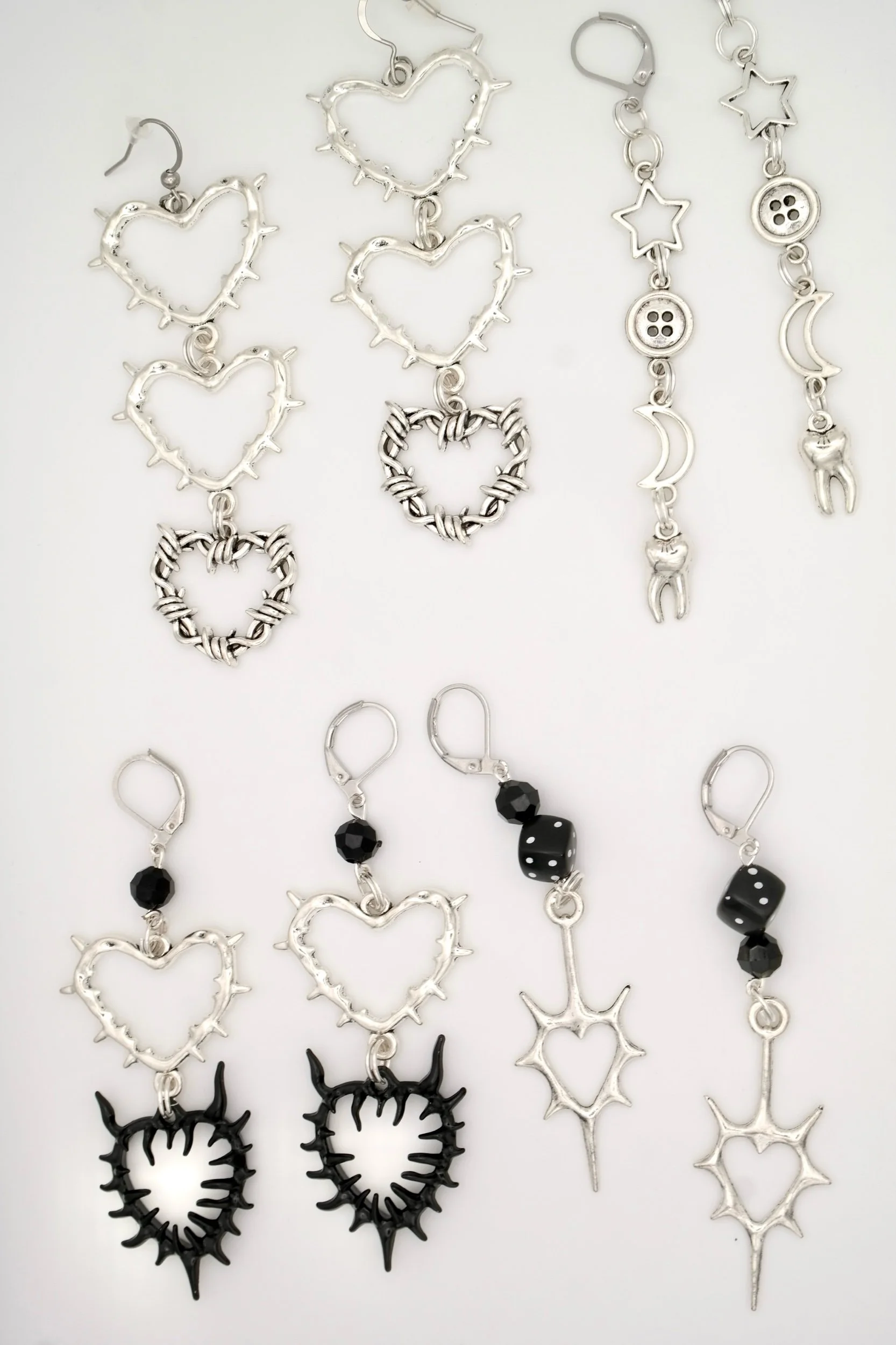 These earrings are the perfect addition to a witch’s or grunge lover’s collection. These earrings hang two silver spiky heart charms and silver barbed wire-wrapped heart charms at the end.