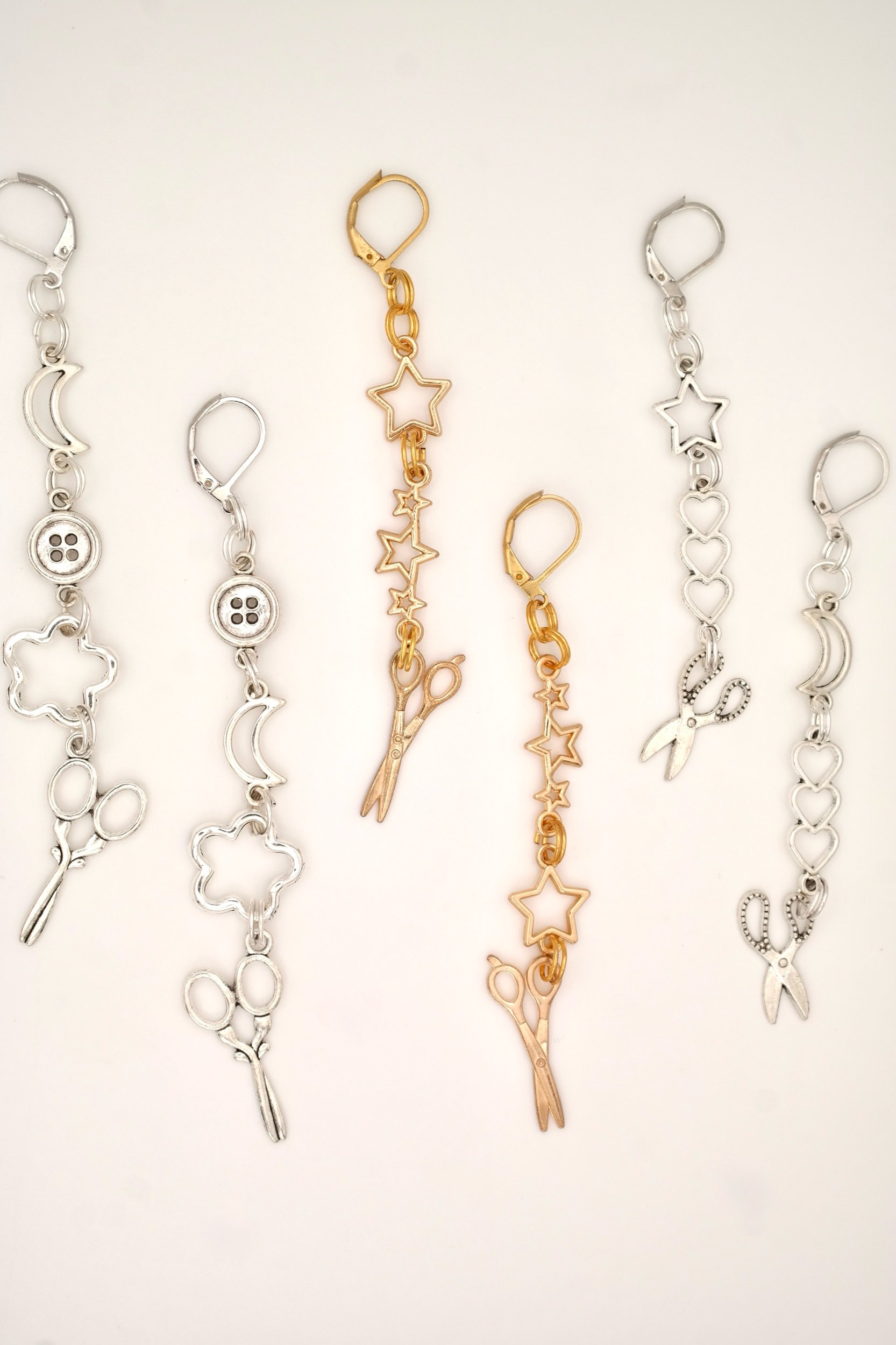 These gold earrings are perfect for a lesbian, sapphic, or hairdresser! They hang small star beads, charms of three stacked hearts, and the cutest scissor charms. The gold earring hooks clip in the back to be secured.