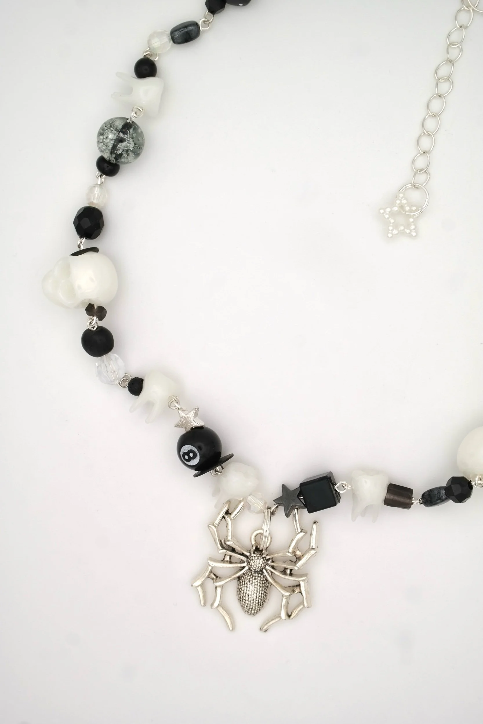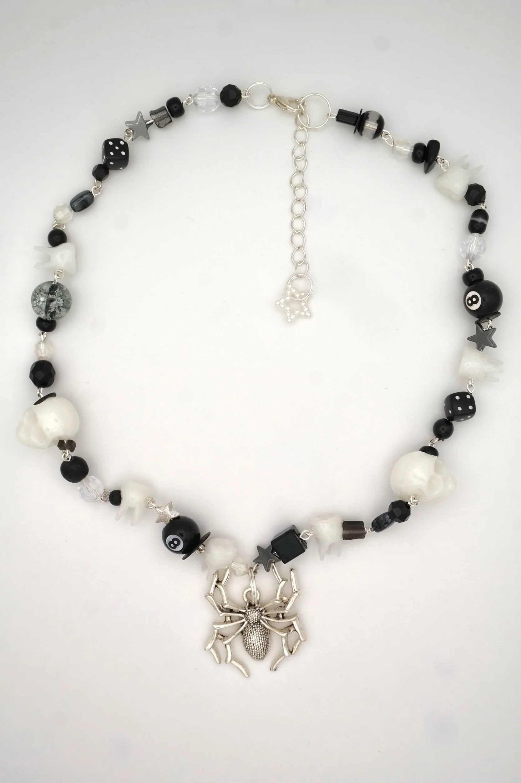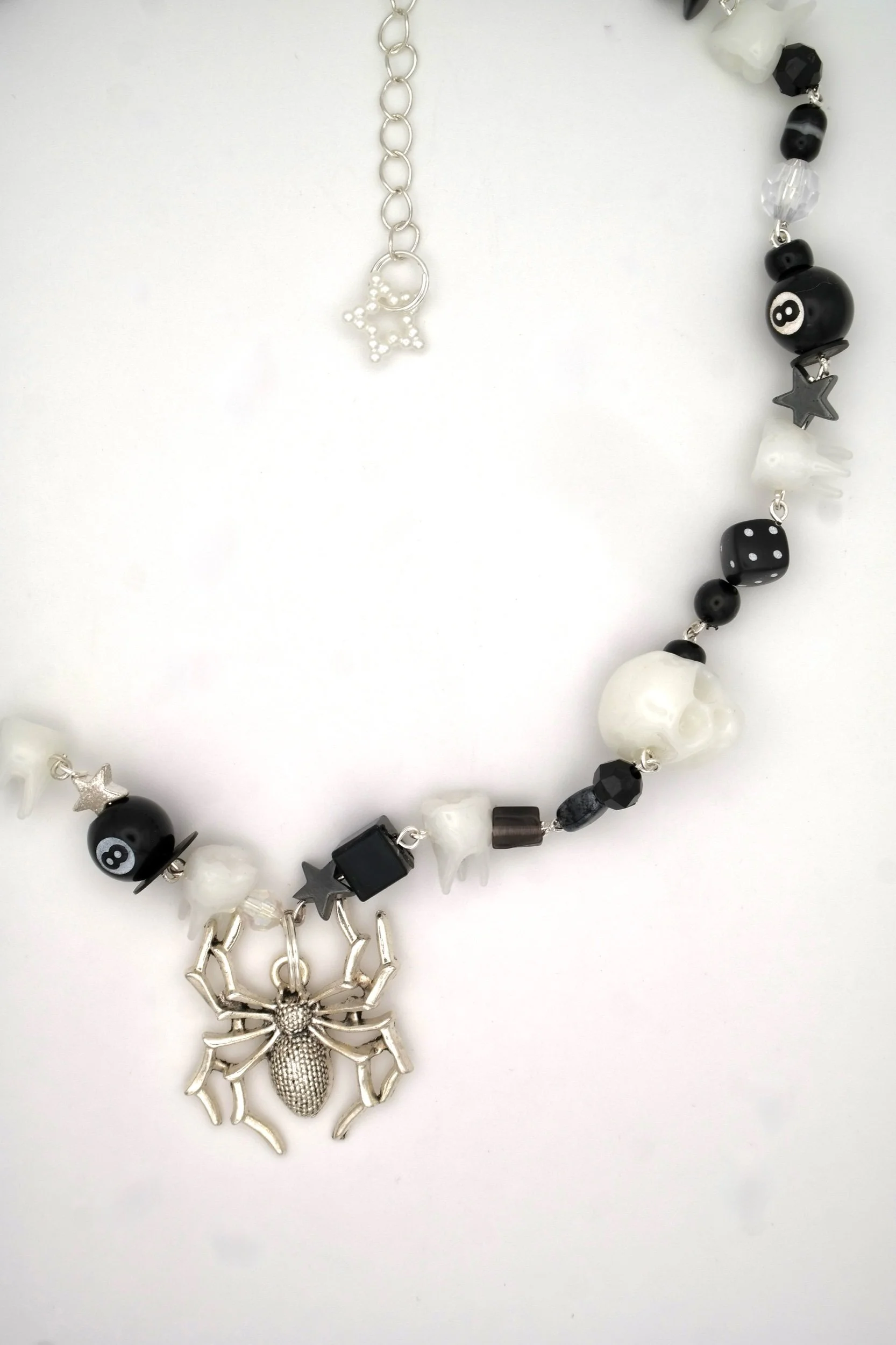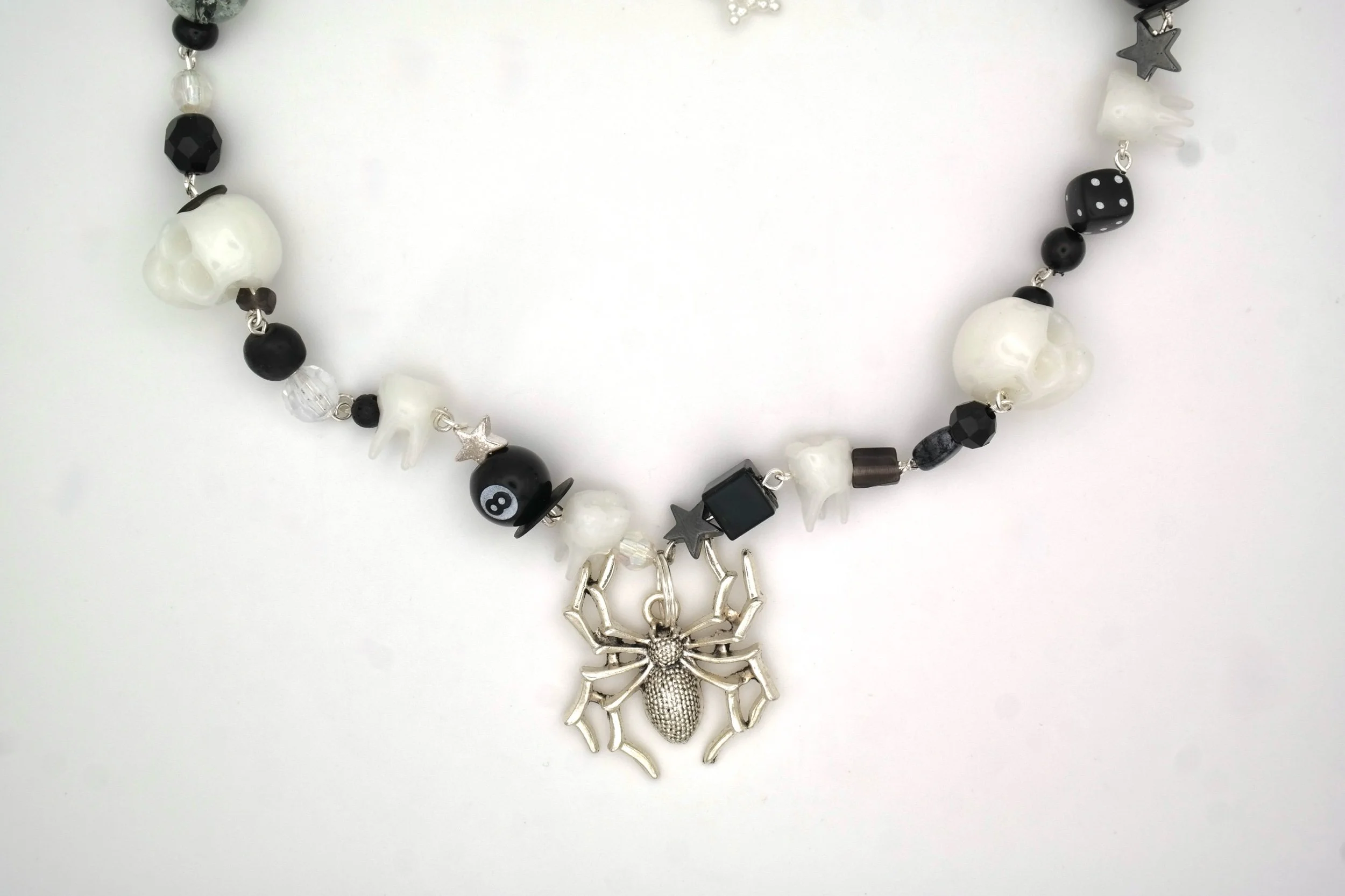 This spooky necklace is made from a witch’s brew bead soup! With a big silver spider charm as the centerpiece, the necklace is beaded with glow-in-the-dark skulls and teeth, magic eight-balls, small black dice, and uniquely shaped black beads. The necklace has a silver extender chain at the end with a pearl star charm.