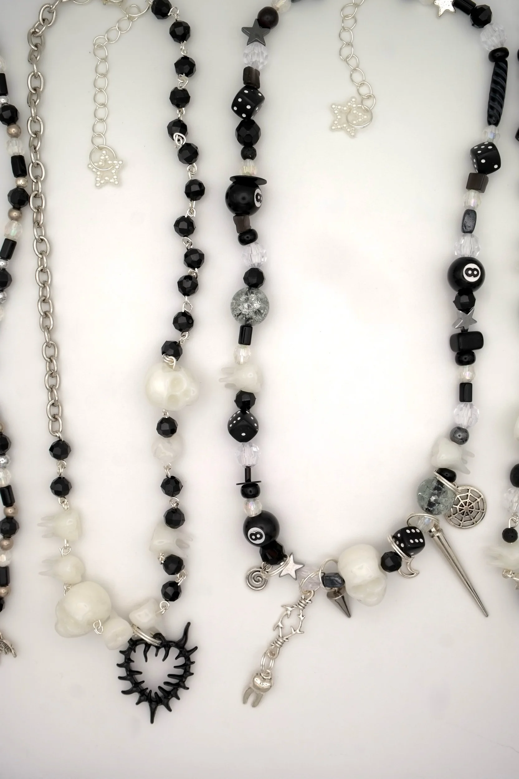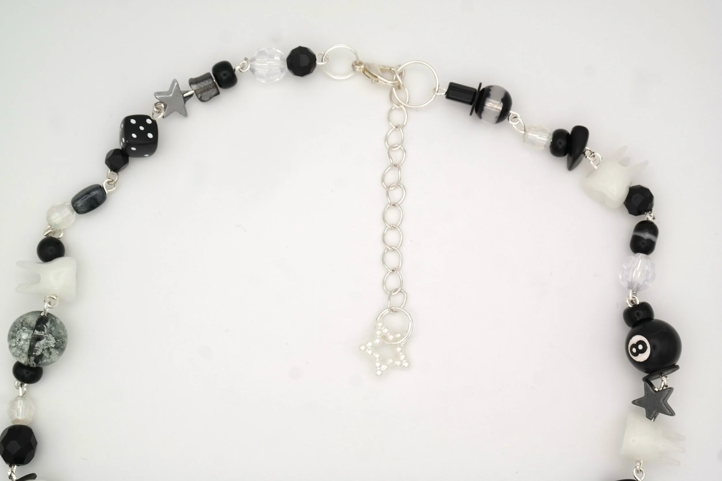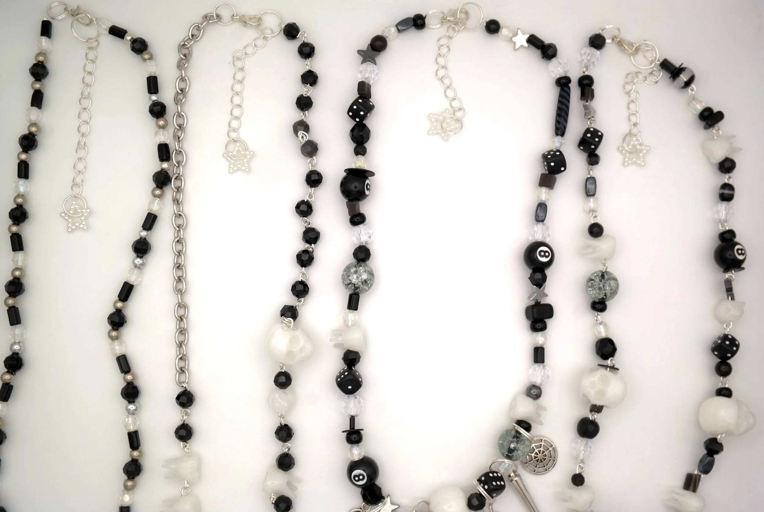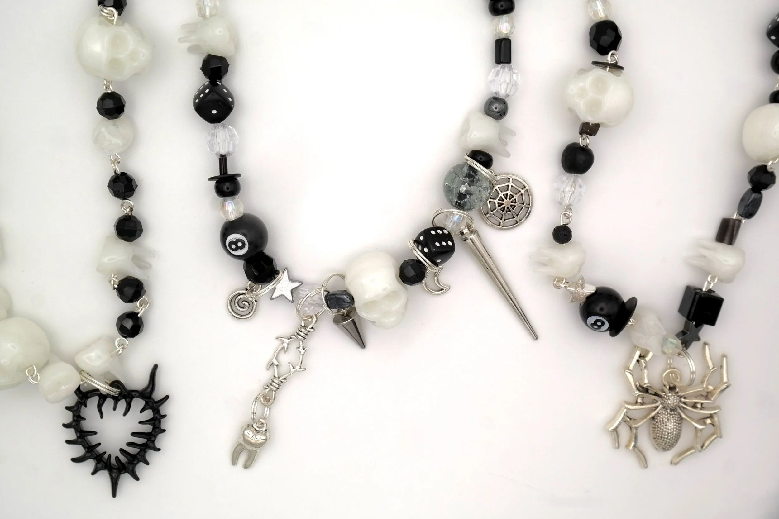 This spooky necklace is made from a witch’s brew bead soup! With a big silver spider charm as the centerpiece, the necklace is beaded with glow-in-the-dark skulls and teeth, magic eight-balls, small black dice, and uniquely shaped black beads. The necklace has a silver extender chain at the end with a pearl star charm.